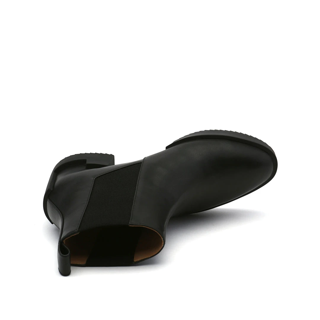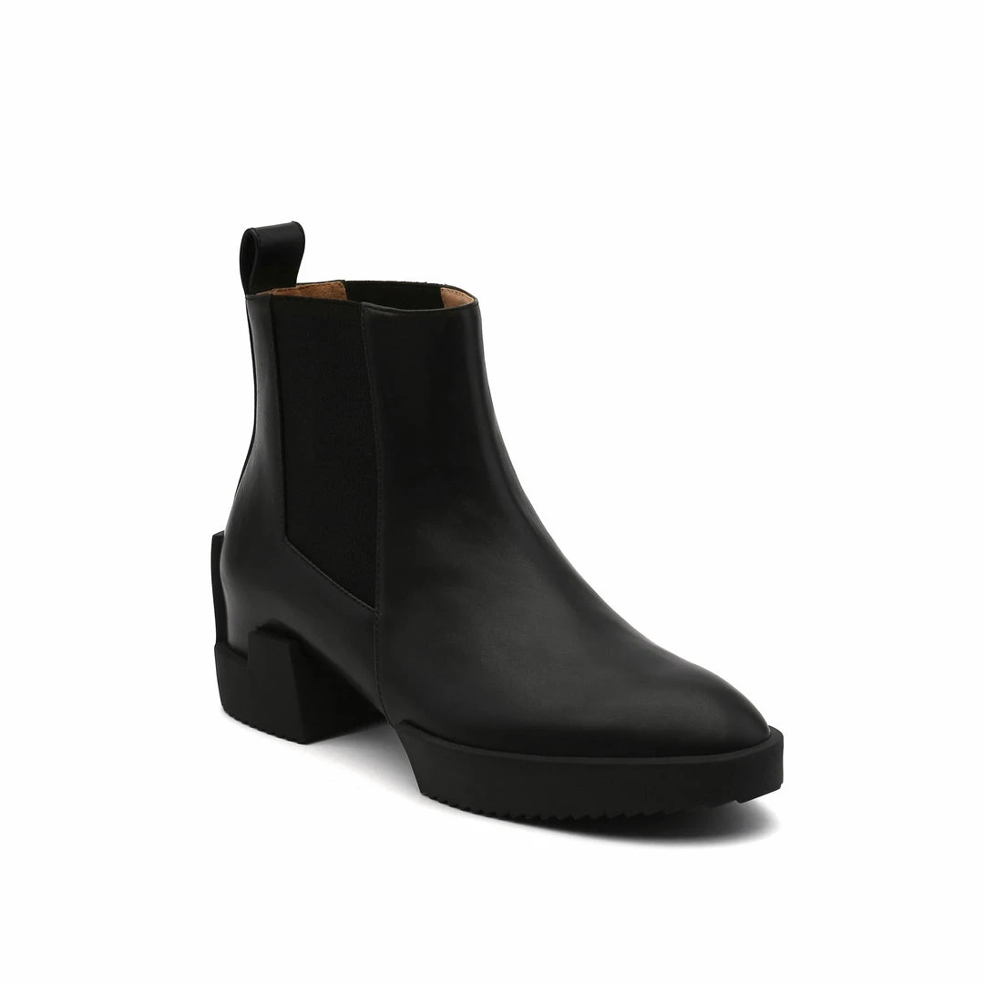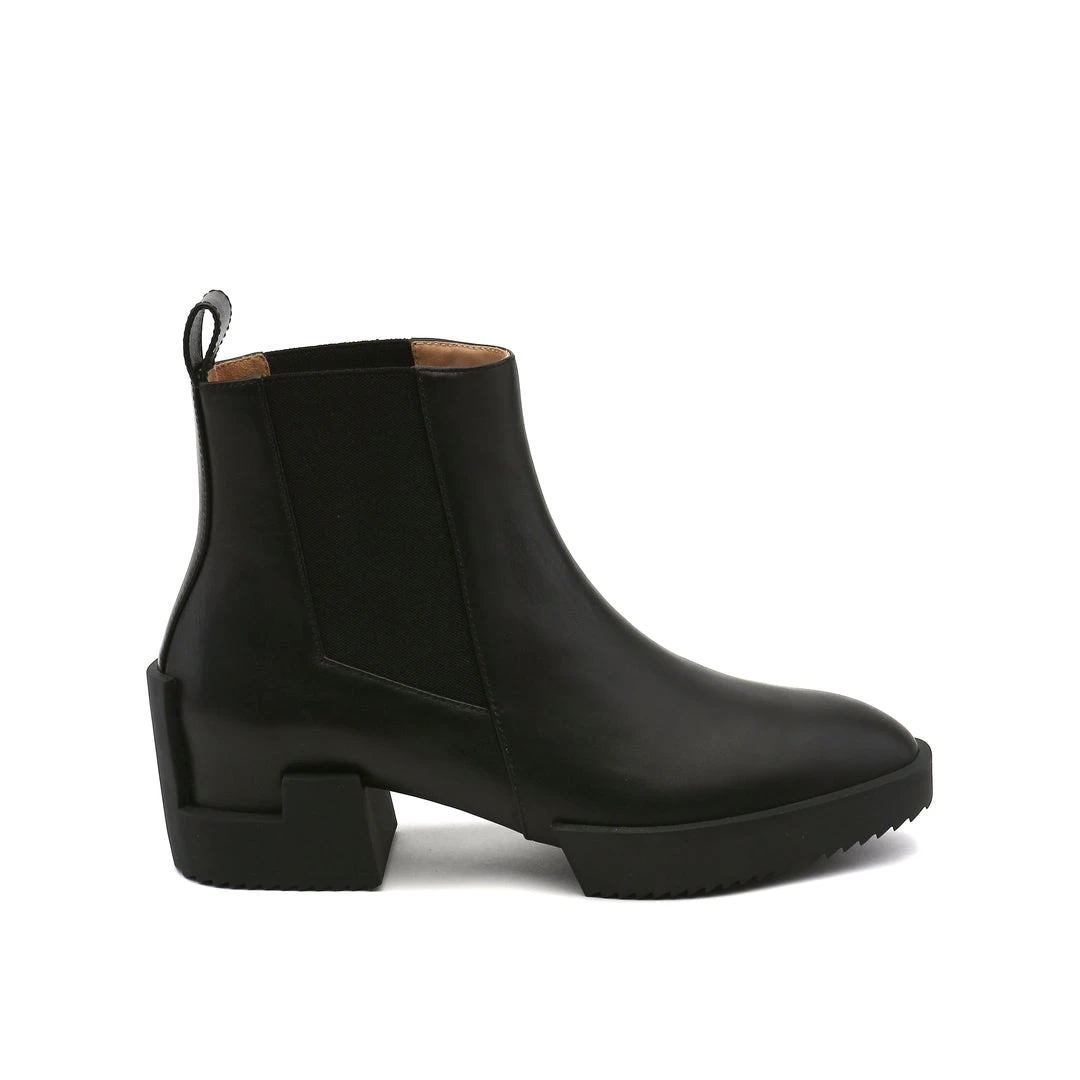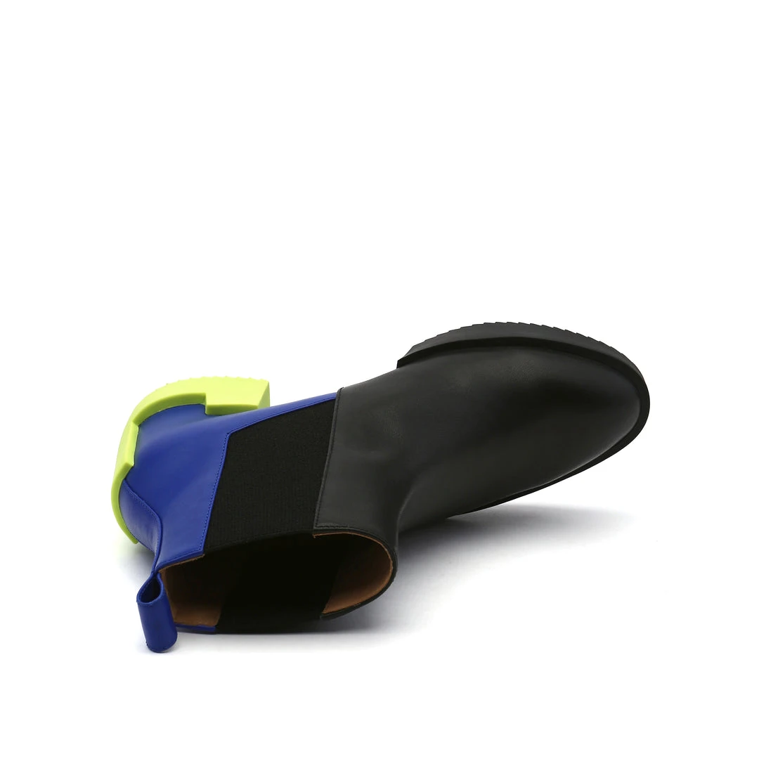 The Cubic Bootie is a Chelsea boot featuring geometric rubber caps that exaggerate the heel.