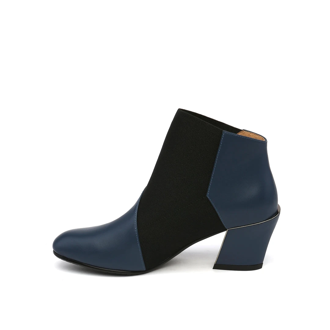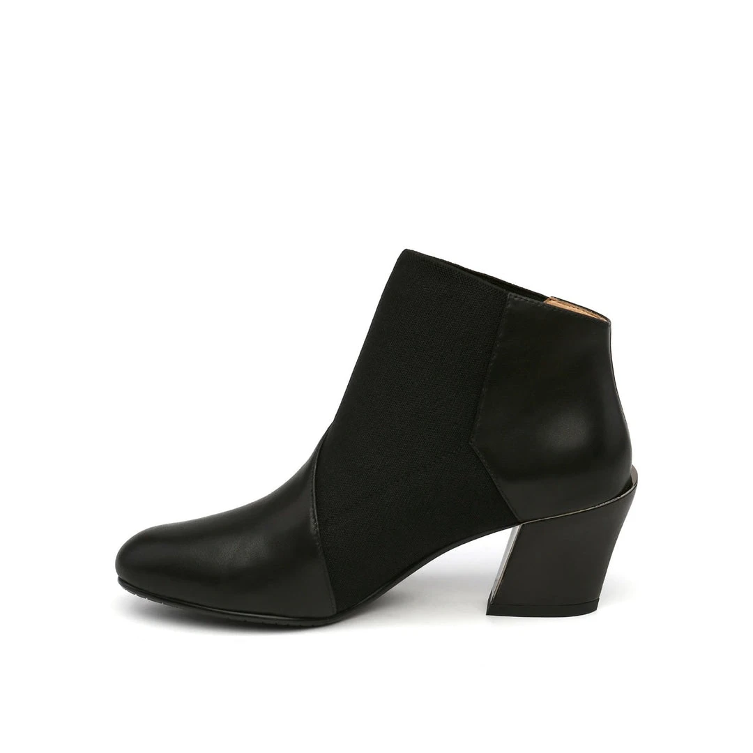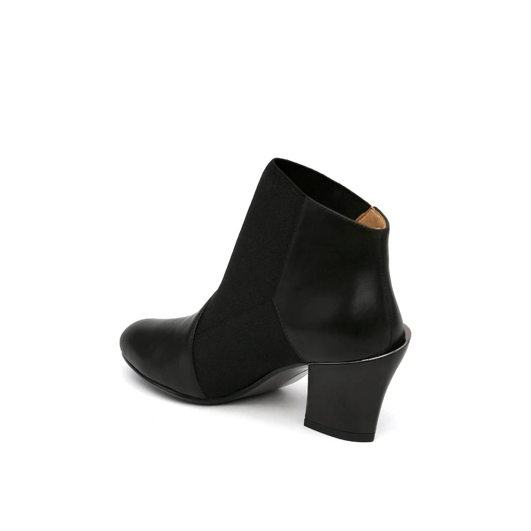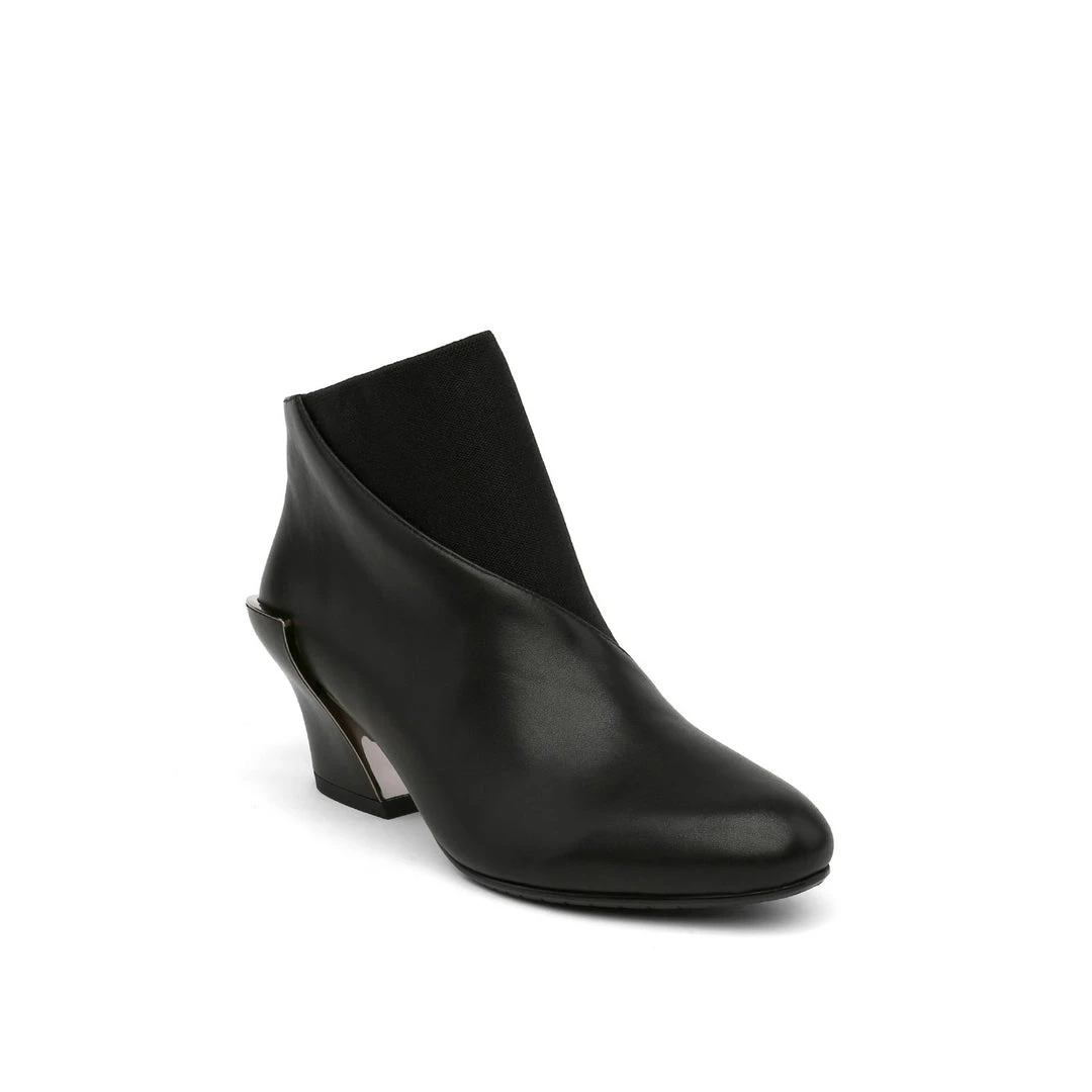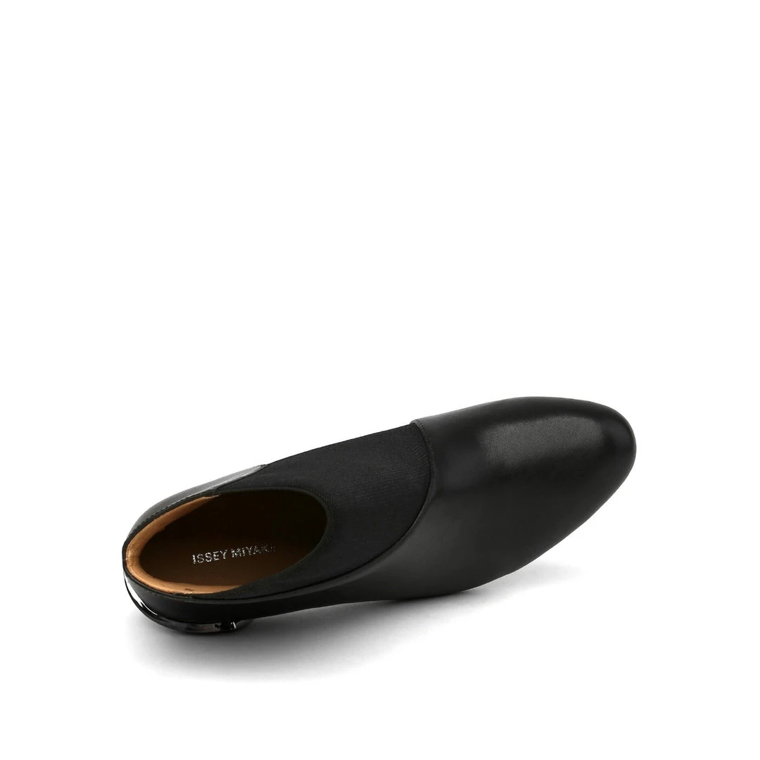 The Wrap Bootie Mid is a mid heel bootie with a soft curving chromed block heel. The wrap was designed with the concept of enveloping the foot with a single sheet of leather. An elastic band is entwined in the upper for easy on and off wear.