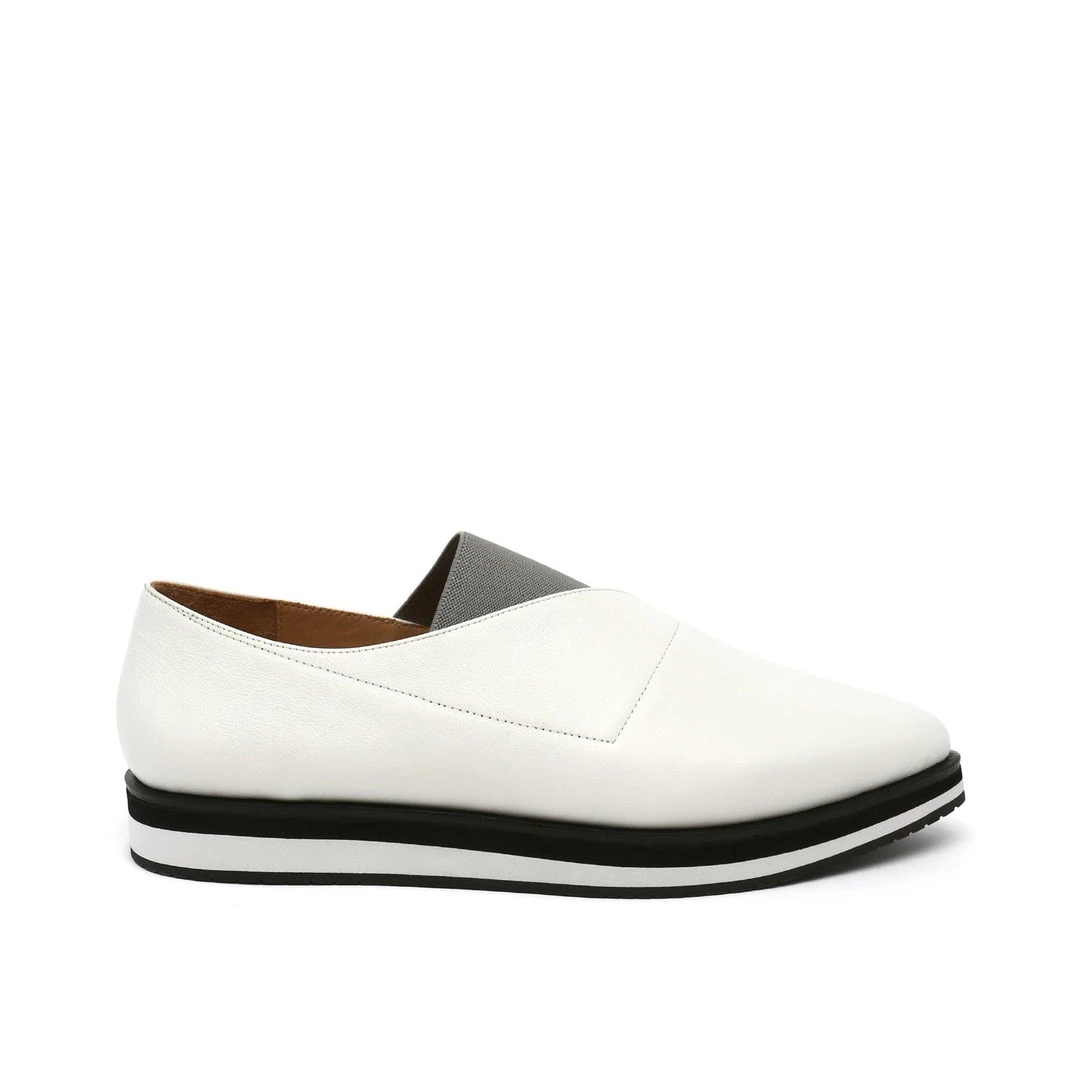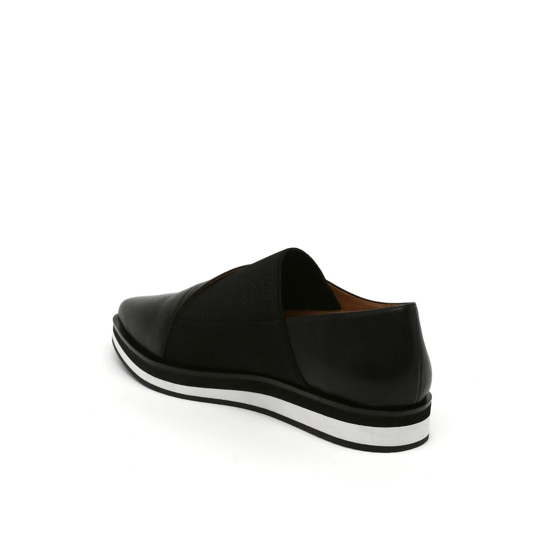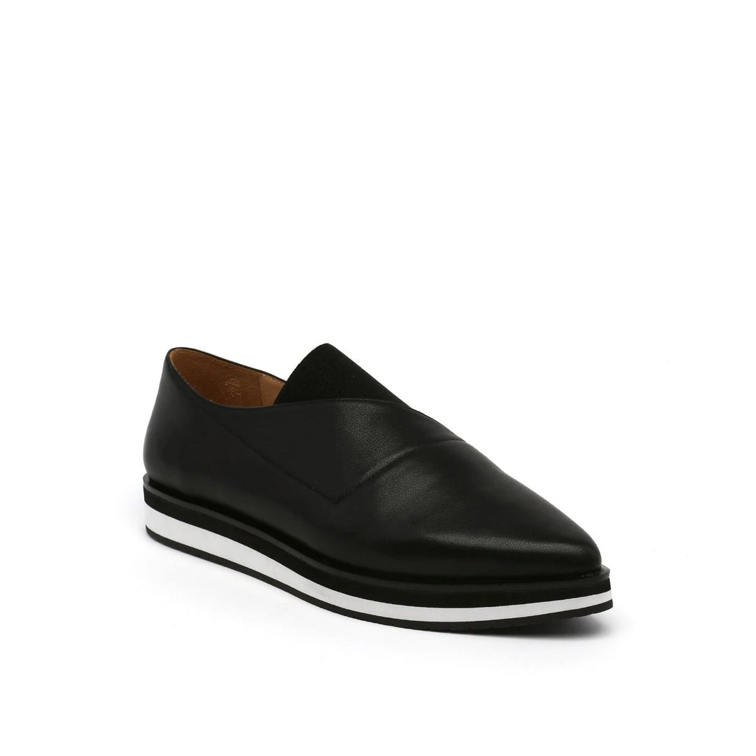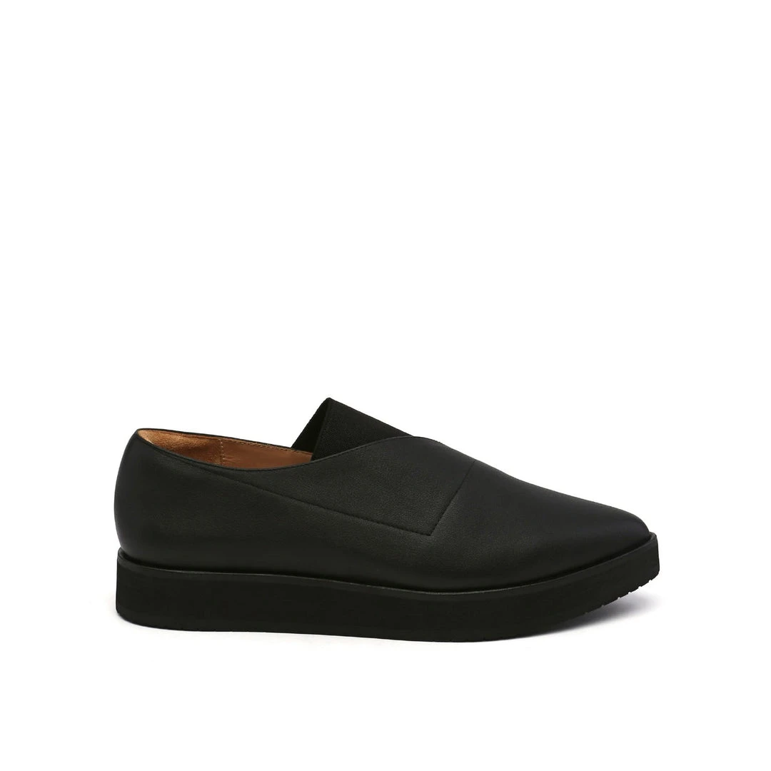 The Wrap Wedge Lo is a pointy toe slip on sneaker. The wrap was designed with the concept of enveloping the foot with a single sheet of leather. An elastic band is entwined in the upper for easy on and off wear.