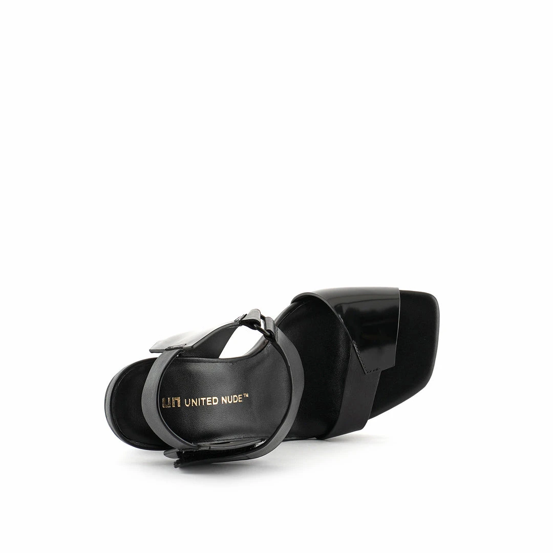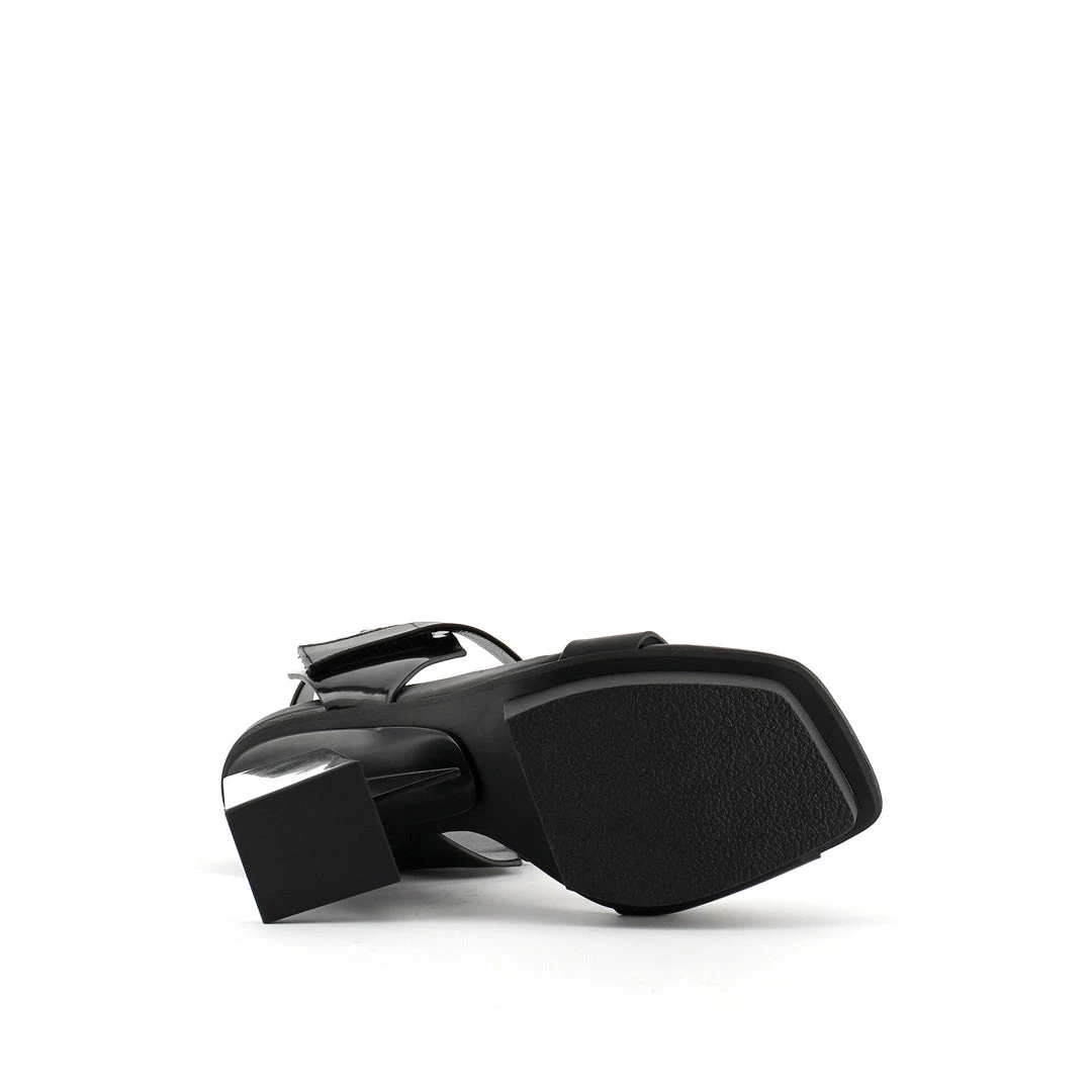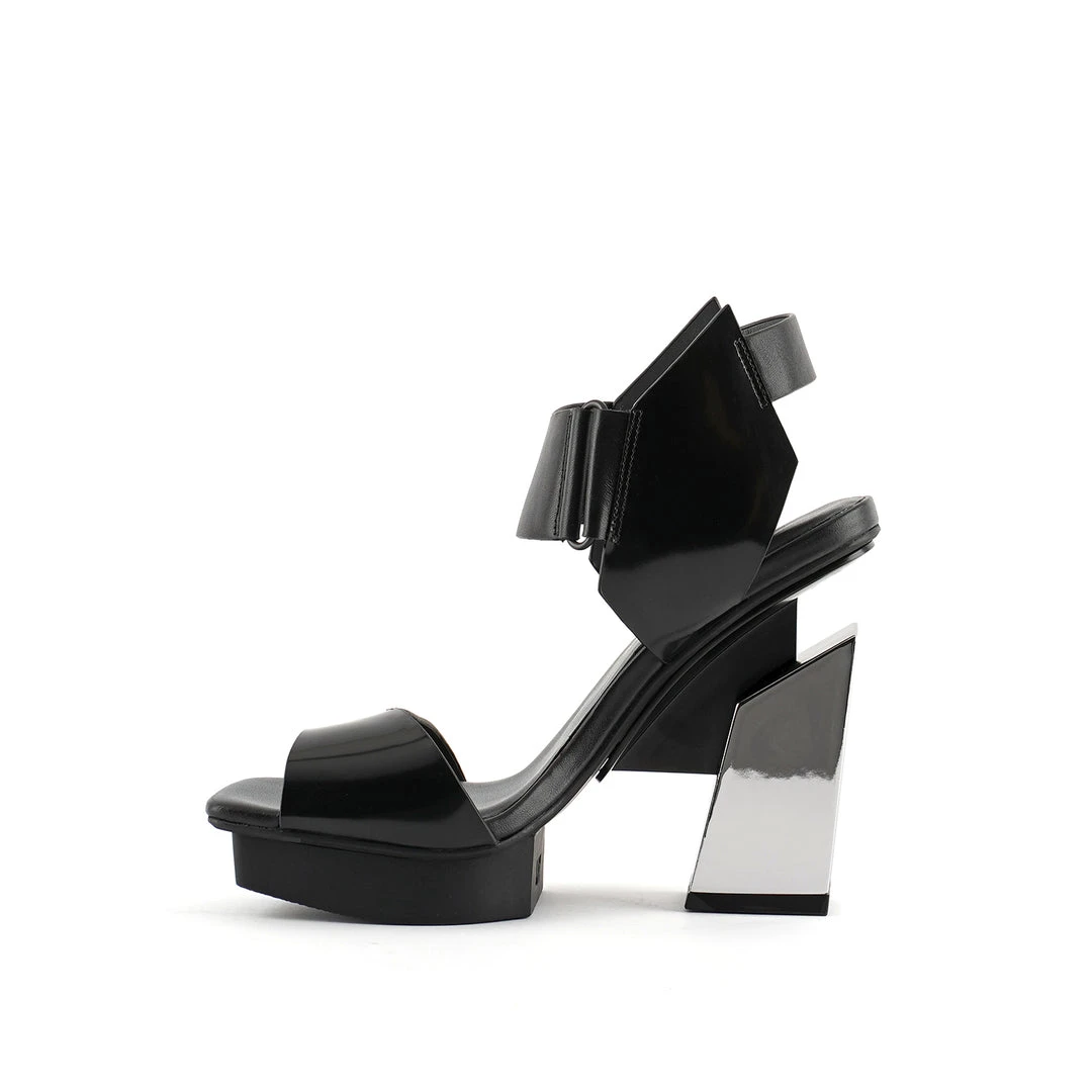 The Arix Sandal features a trapezoid block heel, a nappa leather upper, and a velcro top strap for easy on-and-off wear. This style showcases a modernist appeal and is available in high and mid heel heights.