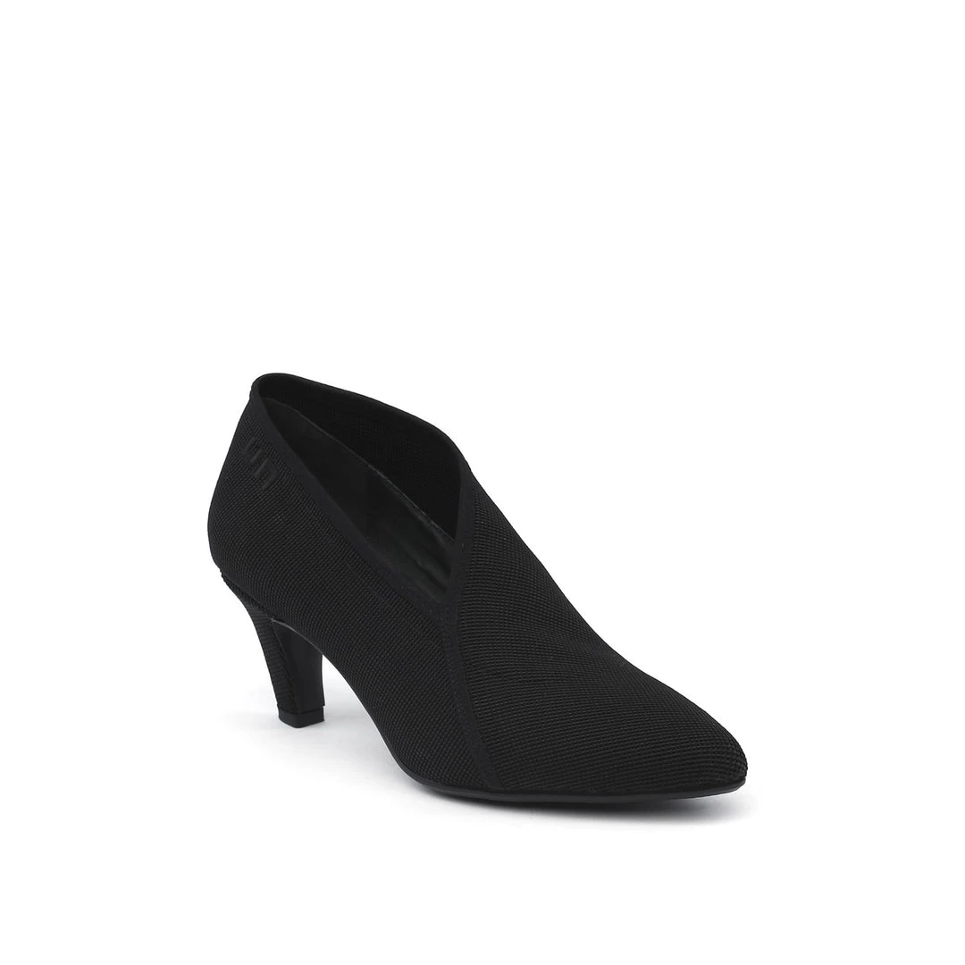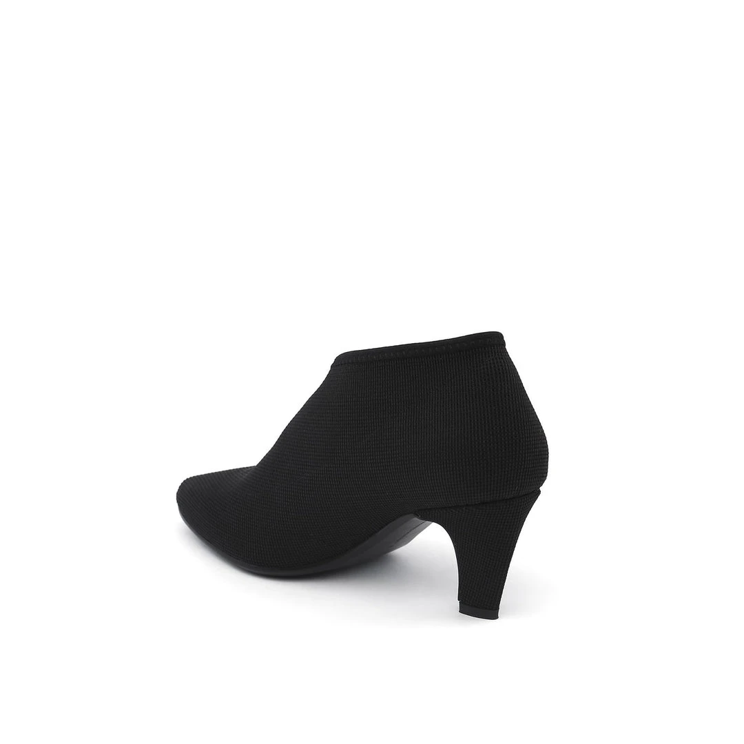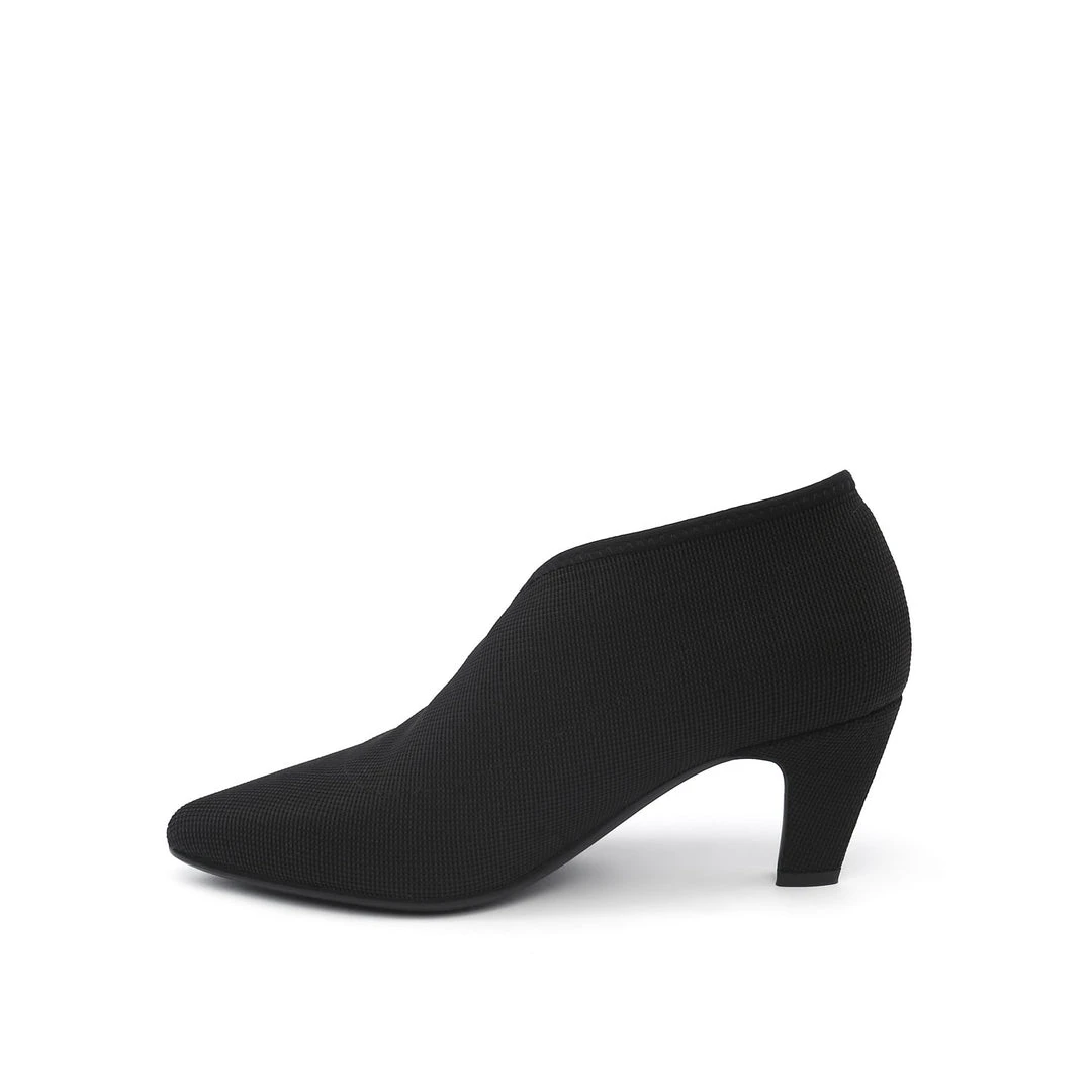 The Fold Lite Mid is a mid-heel ankle bootie with a soft almond toe and asymmetrical top line.