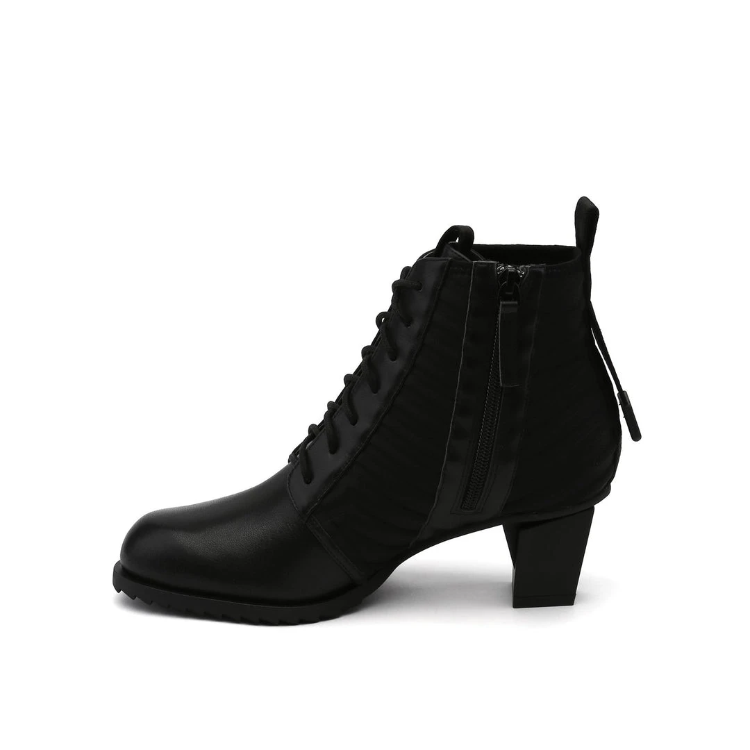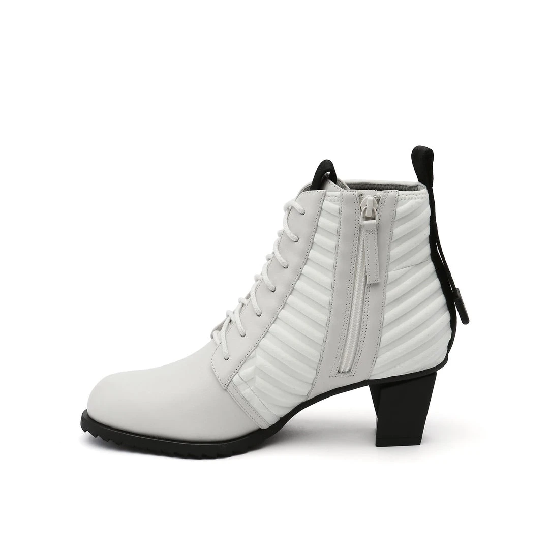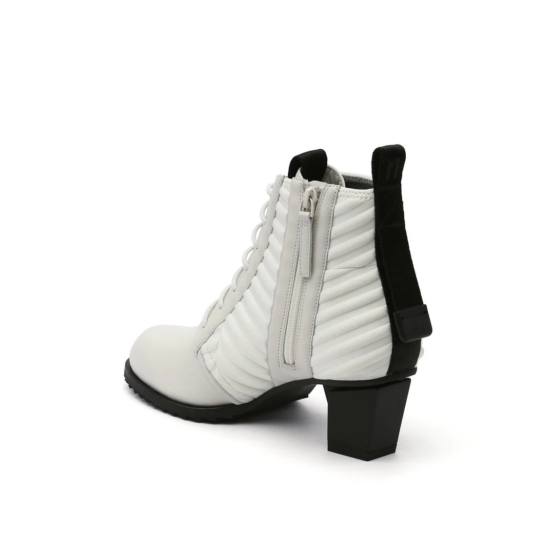 The LEV Lace Bootie is a mid height lace-up bootie with a padded quilted neoprene shaft. The geometric block heel and sharp toothy sole allow for stability and comfort.