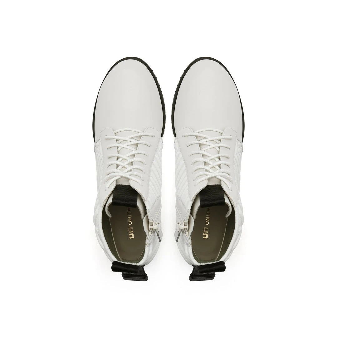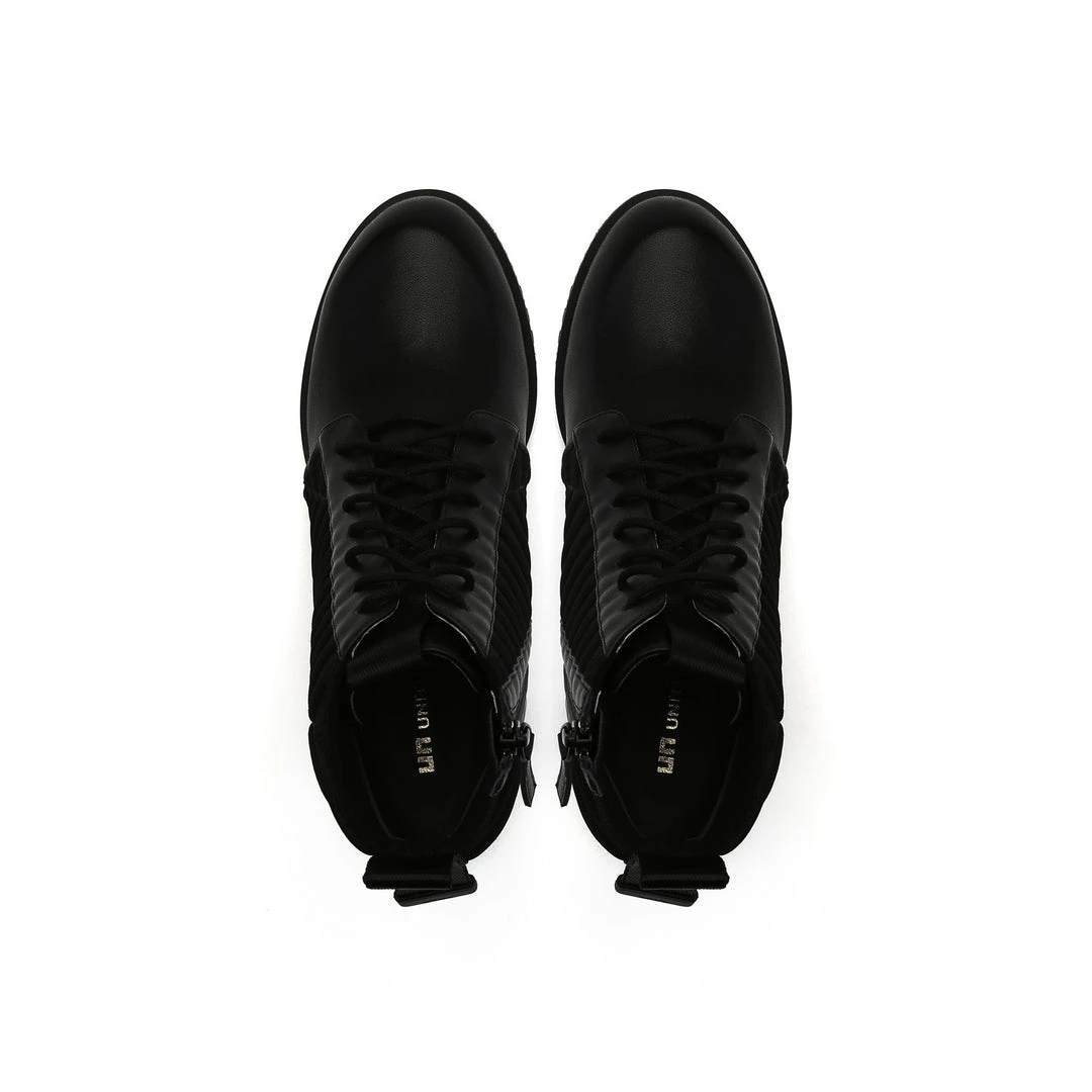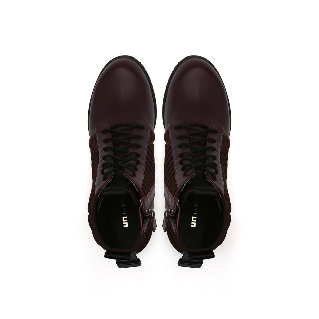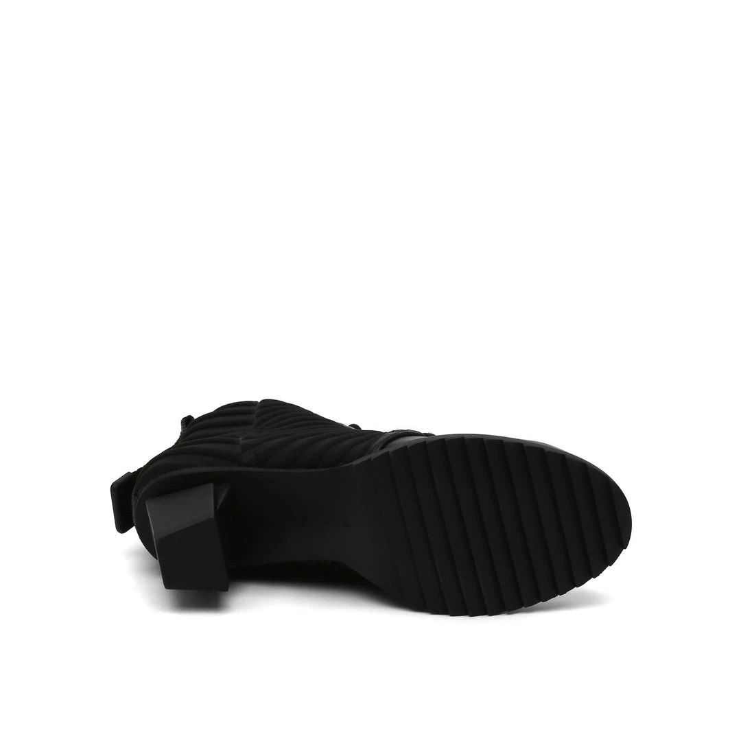 The LEV Lace Bootie is a mid height lace-up bootie with a padded quilted neoprene shaft. The geometric block heel and sharp toothy sole allow for stability and comfort.