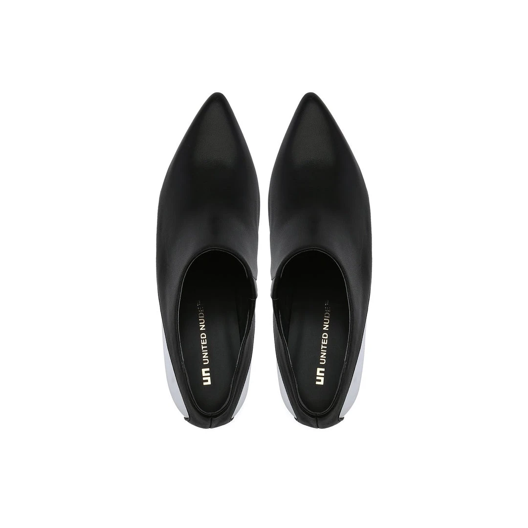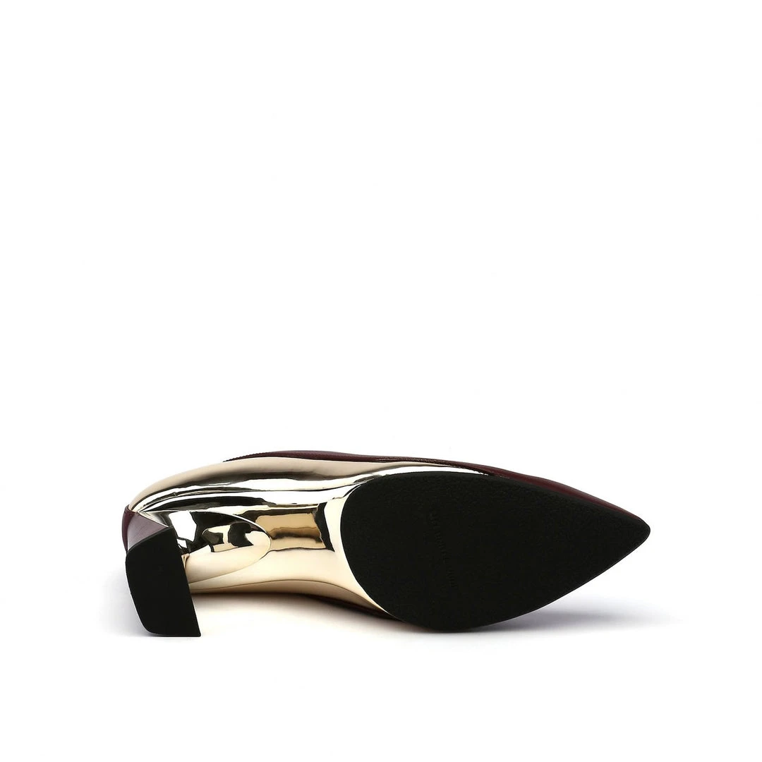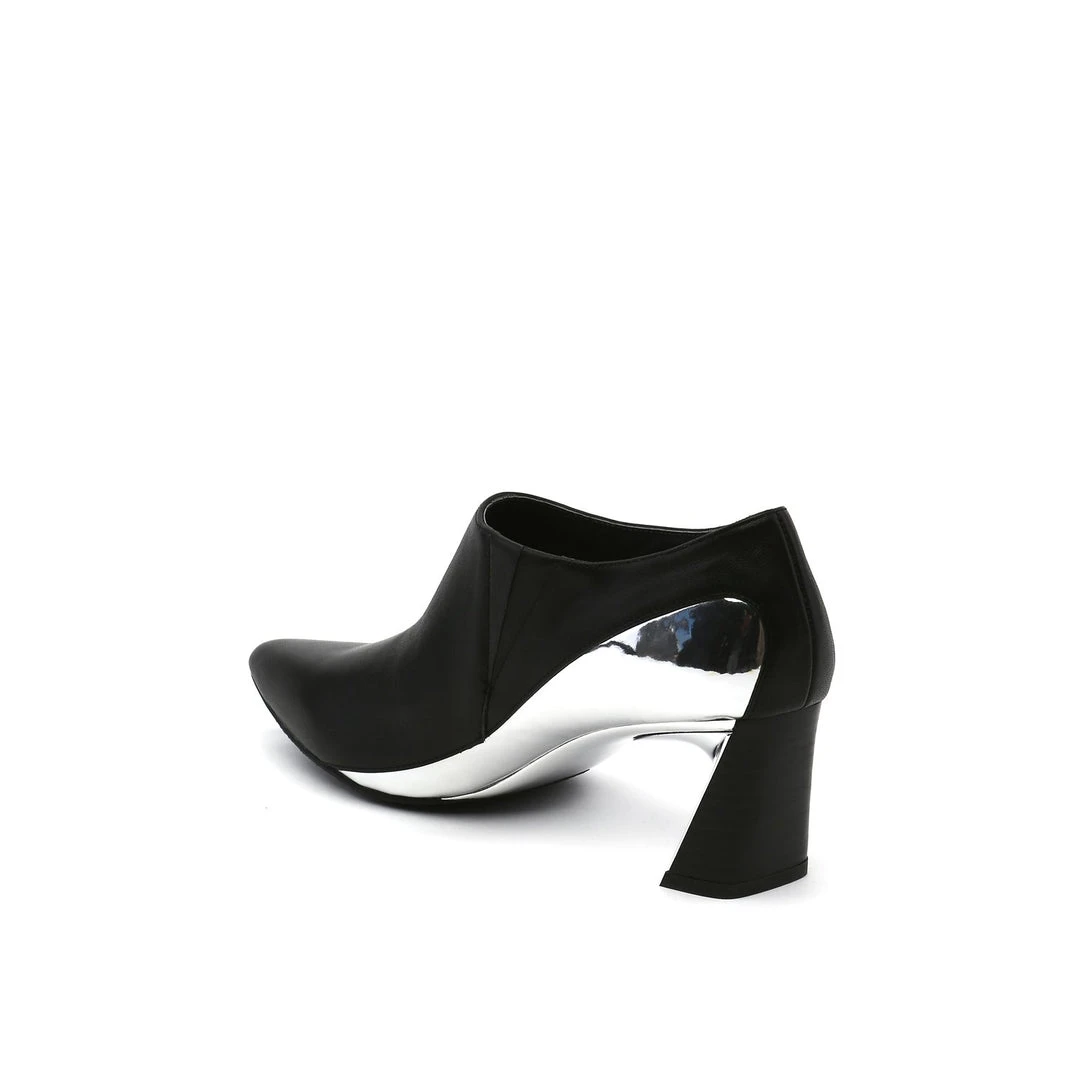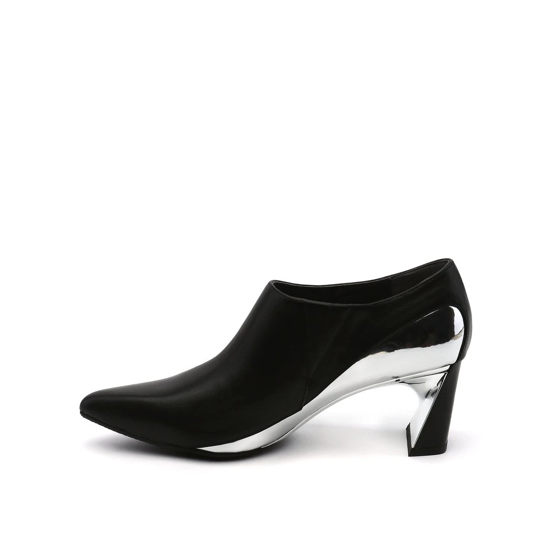 The Molten Flow Bootie Mid is a mid heel pointy-toe bootie with a curved top line and semi-chromed heel that seemingly contorts into an arching metallic panel.