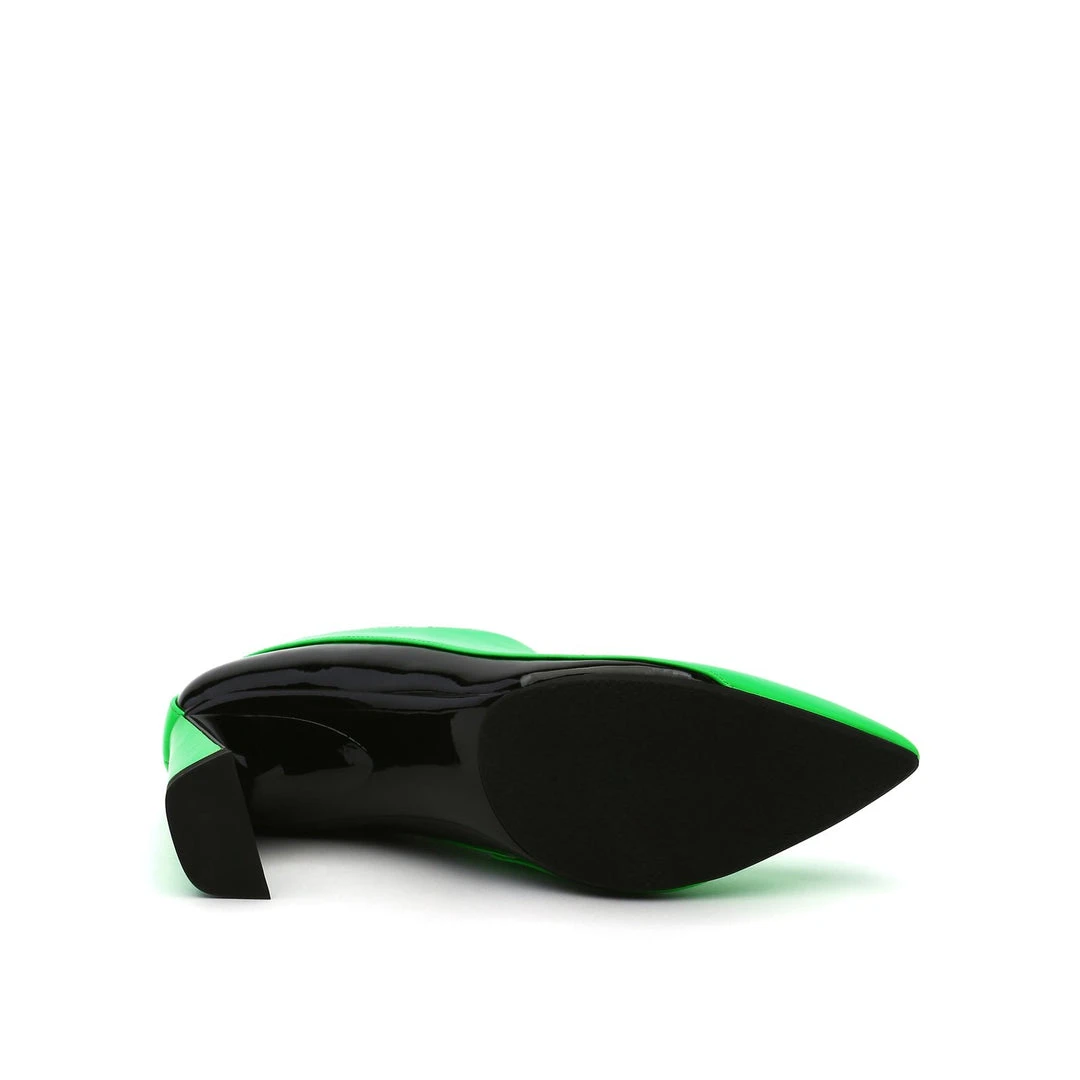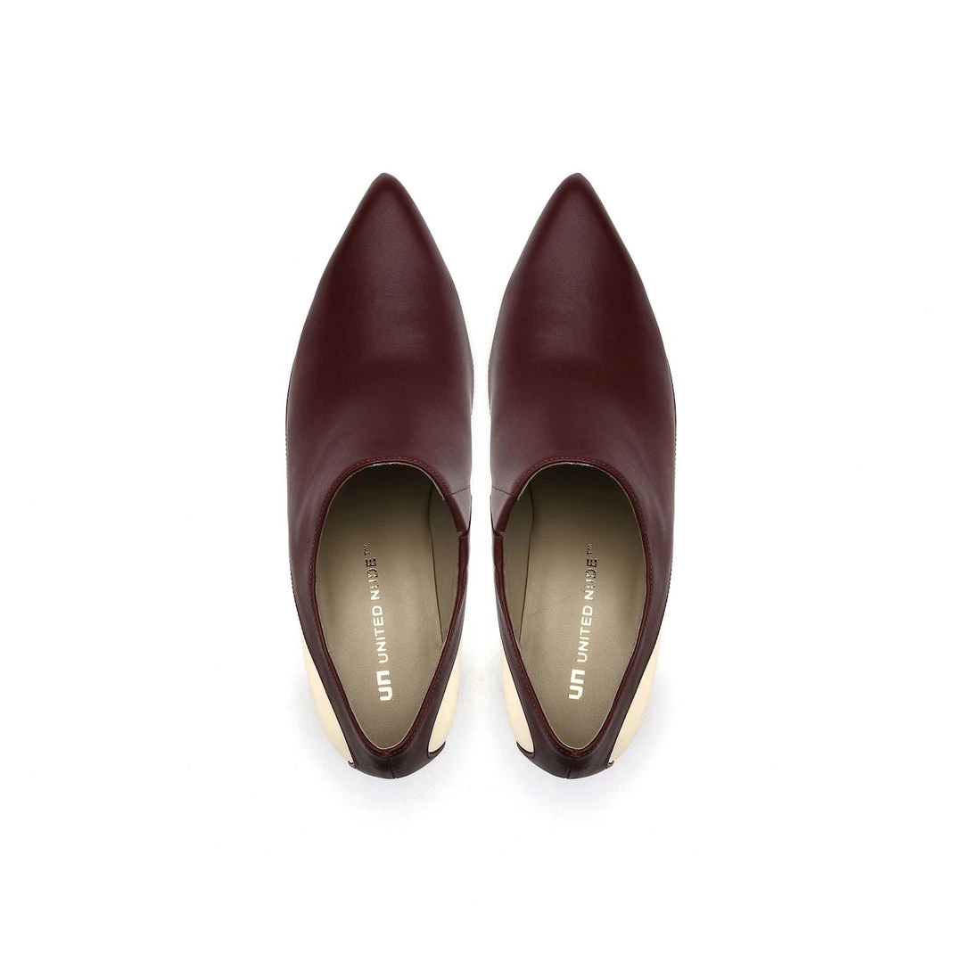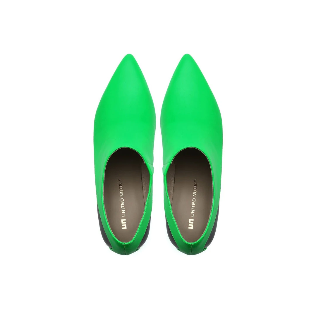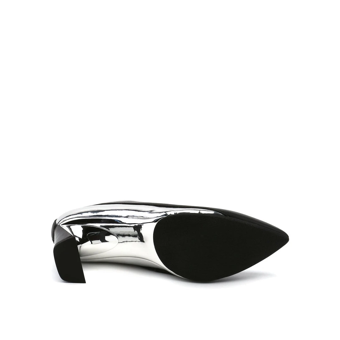 The Molten Flow Bootie Mid is a mid heel pointy-toe bootie with a curved top line and semi-chromed heel that seemingly contorts into an arching metallic panel.
