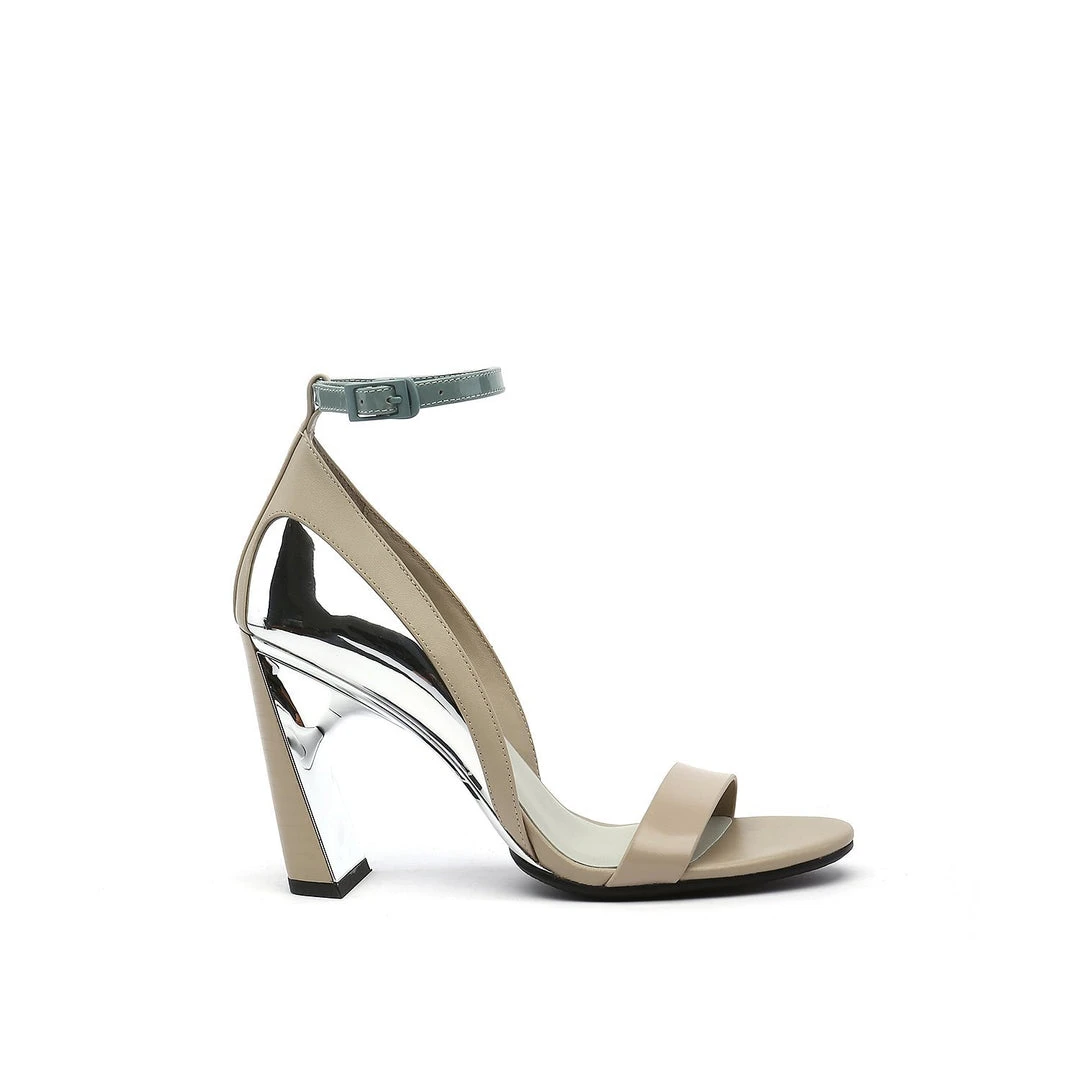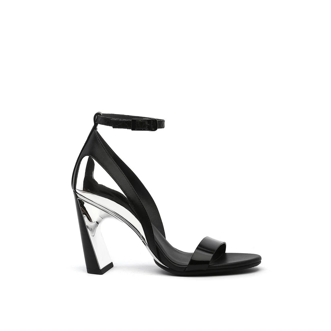 The Molten Flow Sandal Hi is an elegant two strap high heel set on a slim, yet robust heel. The metallic silhouette gives the impression of liquid metal being gracefully poured over the shoe.