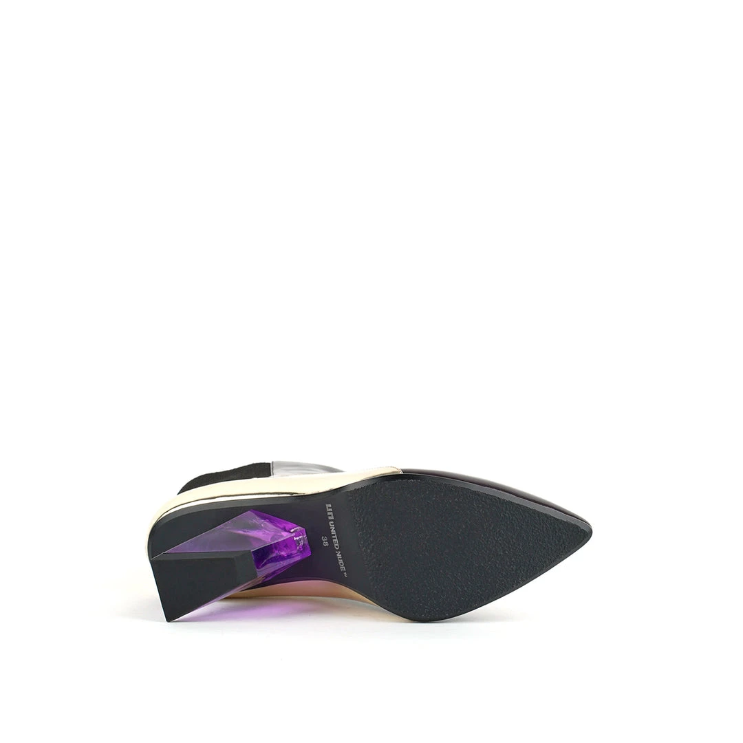 The Rockit Y is a pointed toe bootie featuring diagonal lines on the upper accentuating the angular heel. A leather upper and elastic side panels provide an easy slip-on feel and provide all-day comfort. The striking lucite heels is offered in multiple colors, making this a playful yet versatile style.