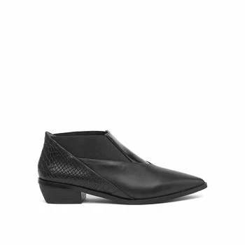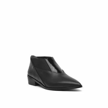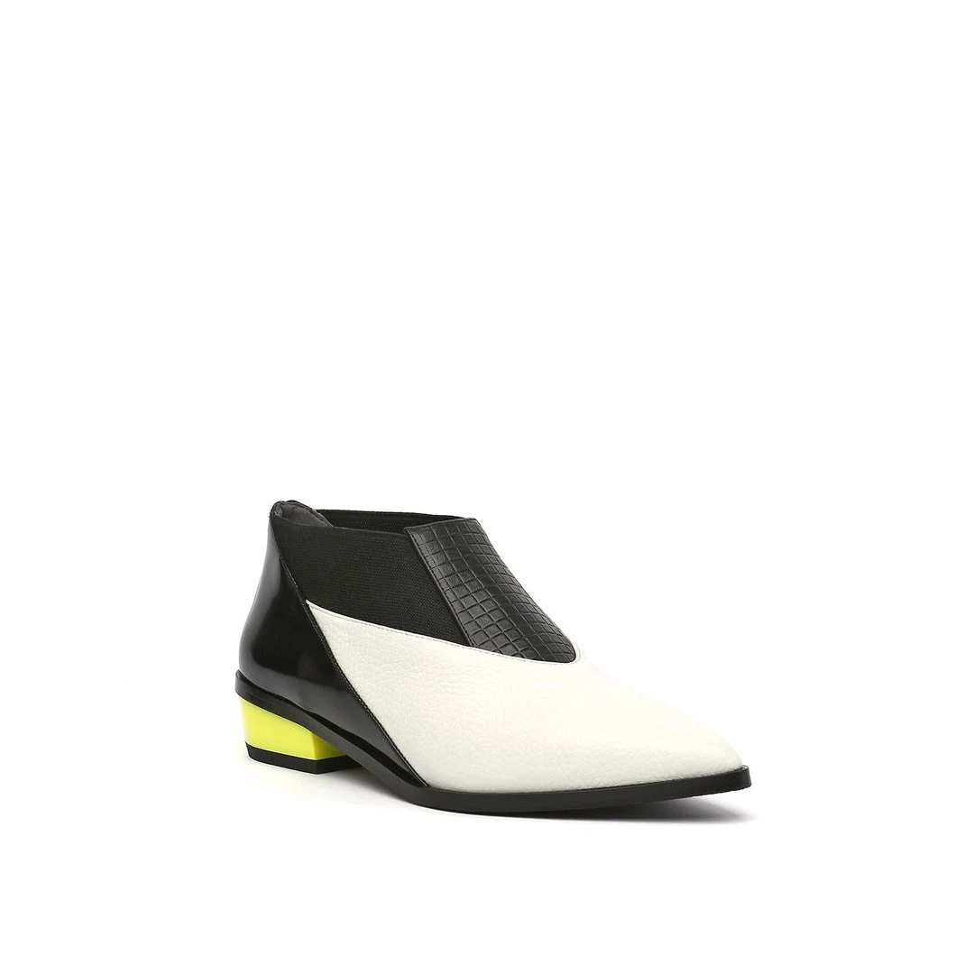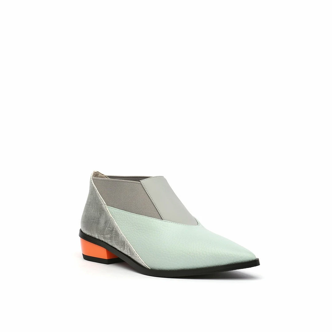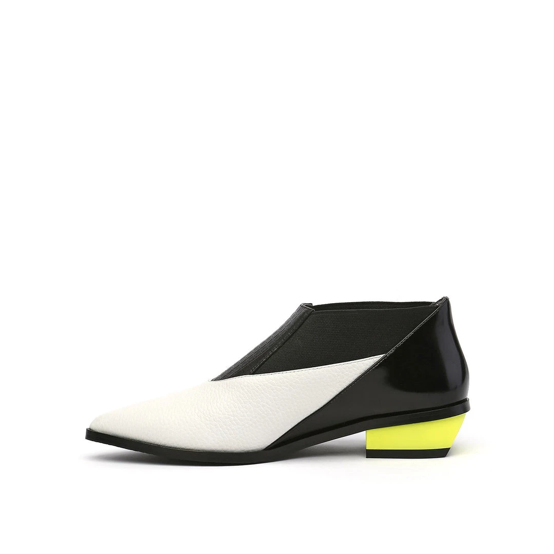 The Spark Bootie Lo is a pointed toe flat bootie. A patchwork of leathers and elastics create a bold statement.