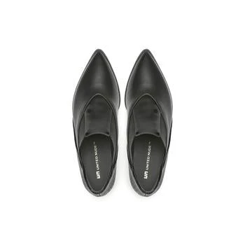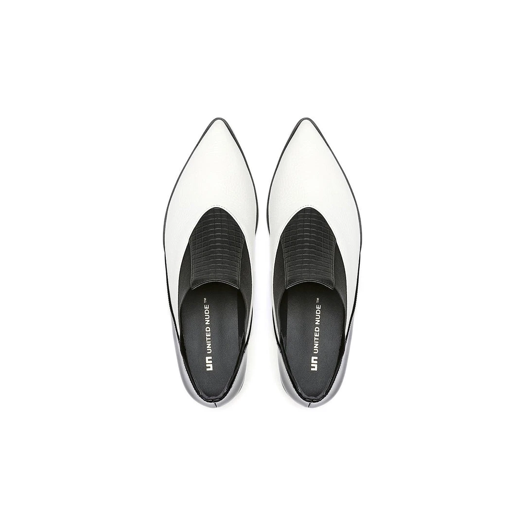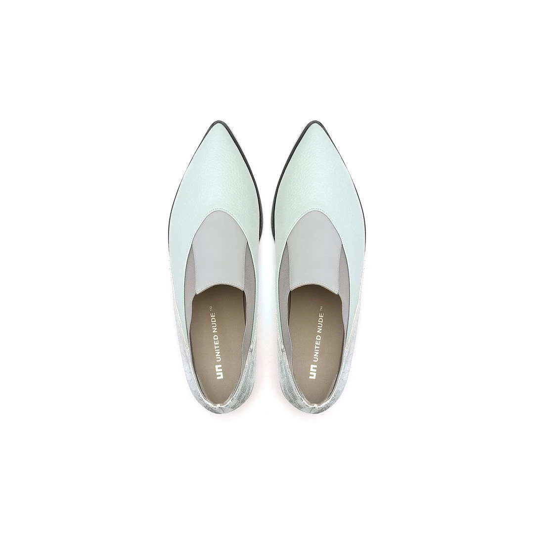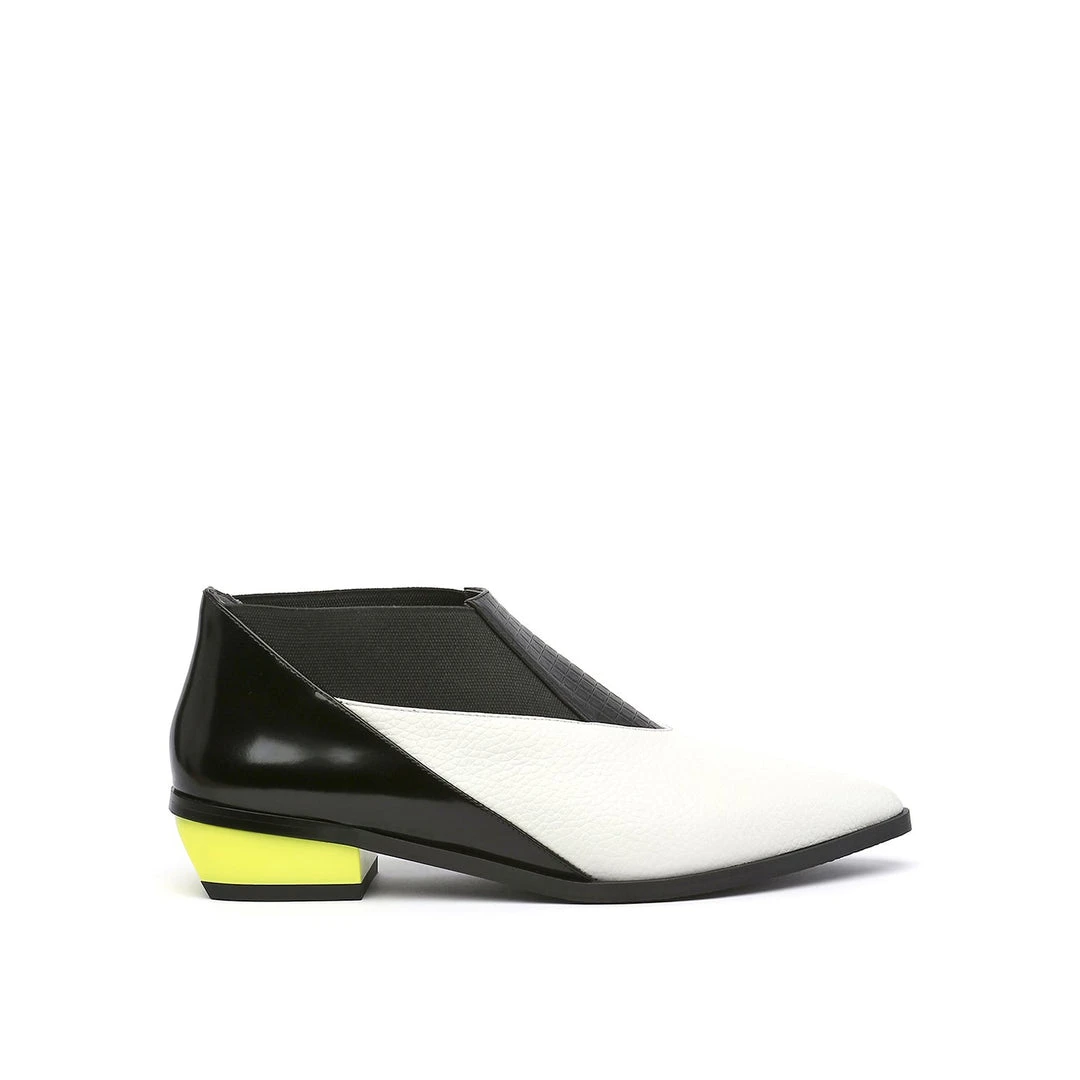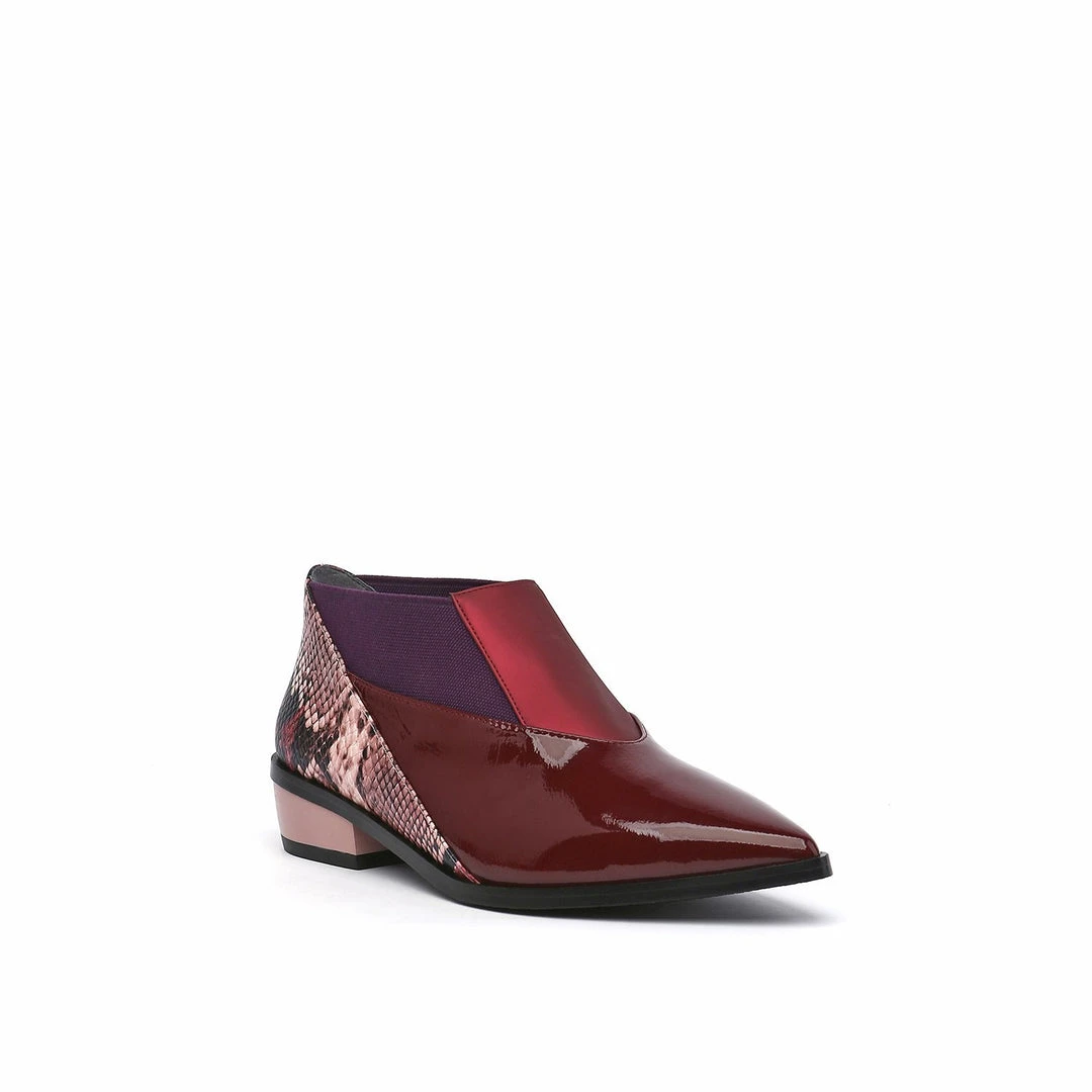 The Spark Bootie Lo is a pointed toe flat bootie. A patchwork of leathers and elastics create a bold statement.