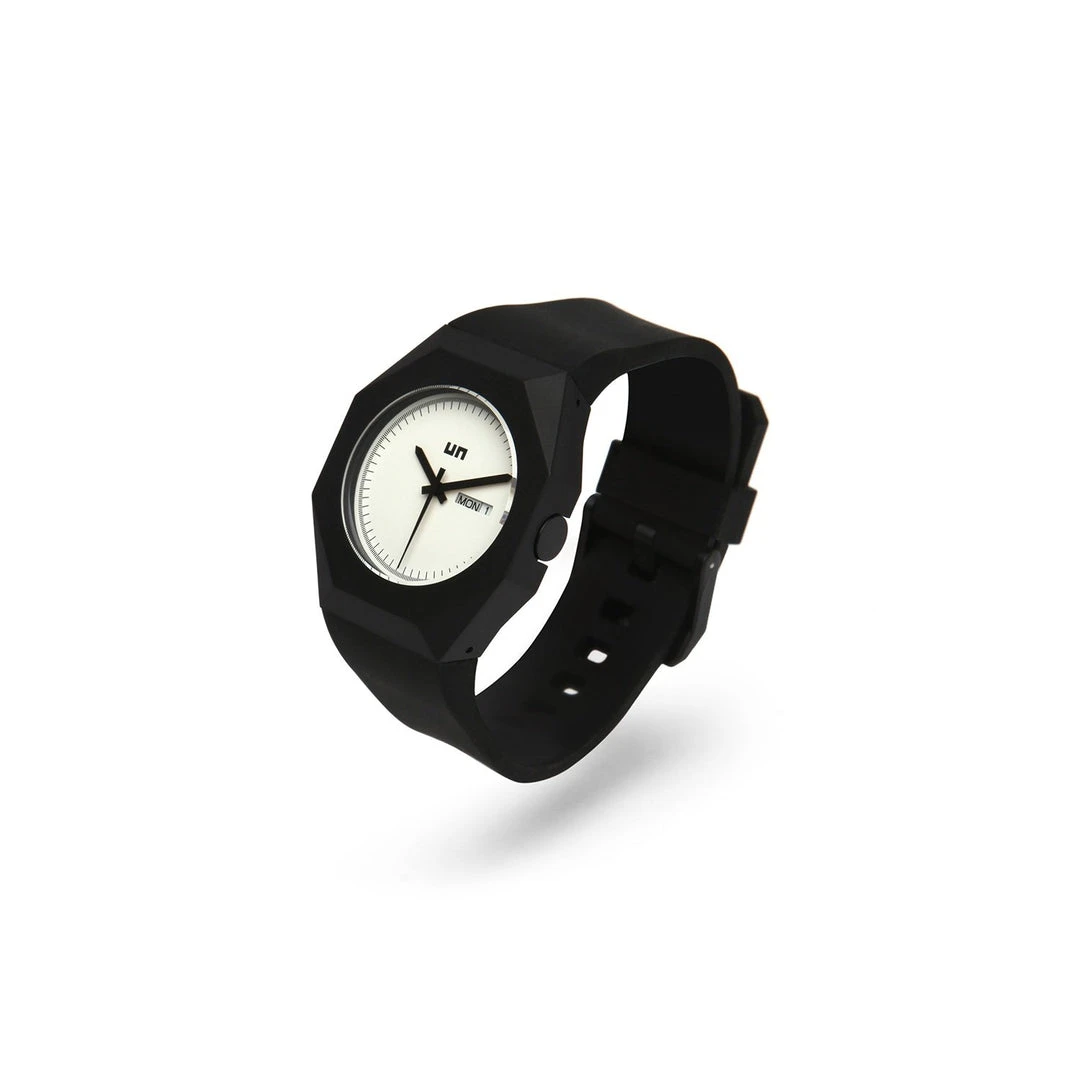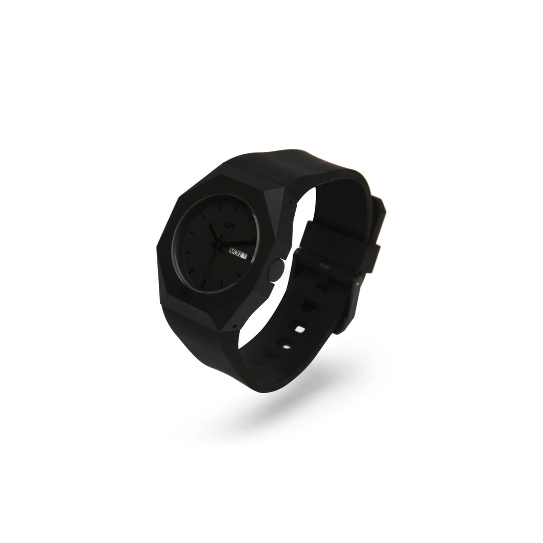 The Stealth Analogis a contemporary play on 70s watch design. It features a circular face and a faceted case design. Water-resistant and is equipped with a Japanese Miyota movement displayingtime, day, and date.