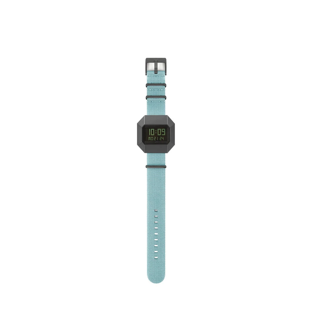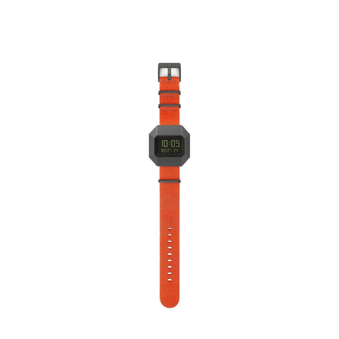 The Stealth Digital Nylon is a minimal hexagonal digital watch with a nylon band. Water-resistant and equipped with a United Nude custom-made movement with time, day, date, and backlight functions.