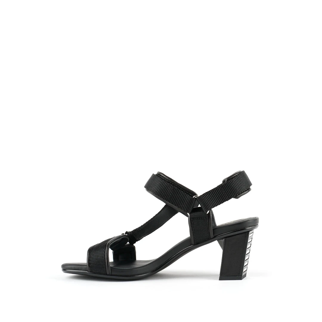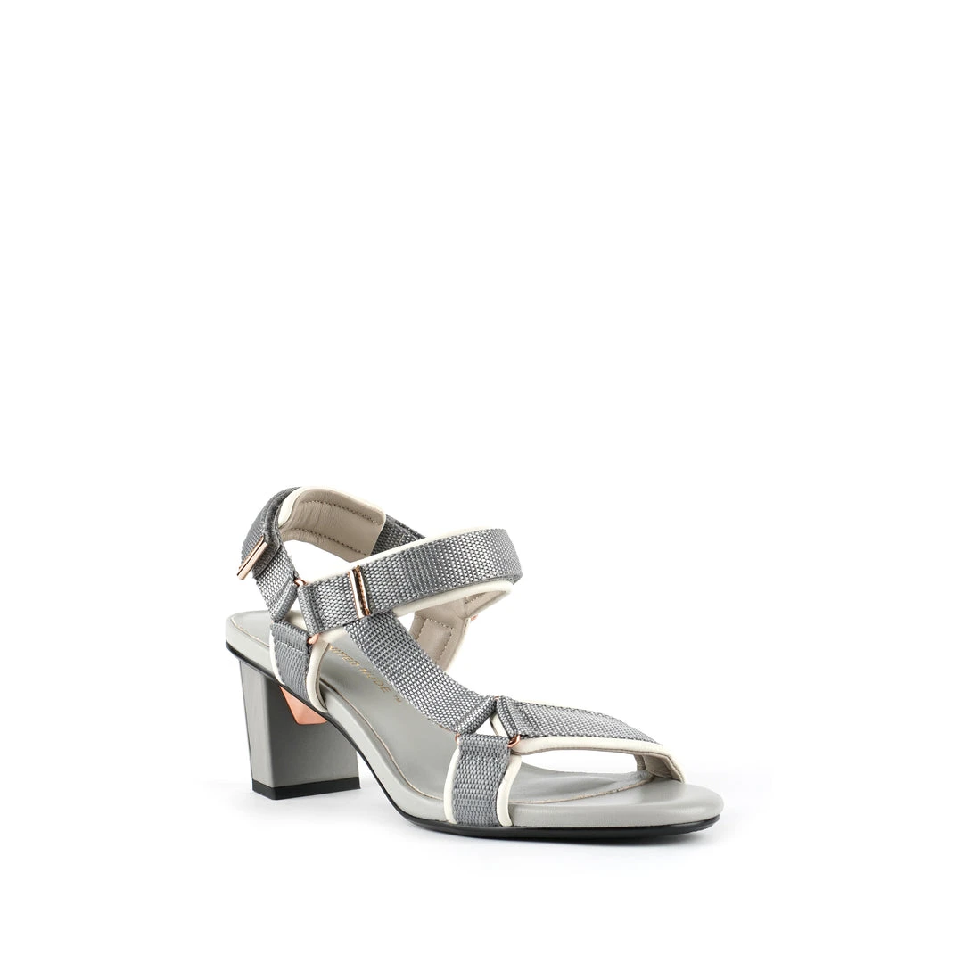 The Aura Mid is a sporty mid heel sandal that sits on a leather wrapped angular heel with inset laddered metallic detailing and a chromed triangular wedge that extends from the shank. Utilitarian style nylon belts with two adjustable velcro enclosures complete the look.