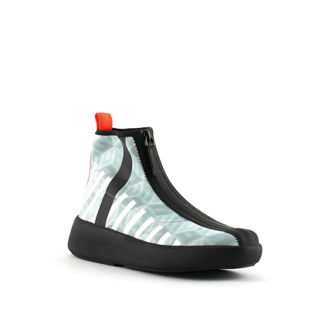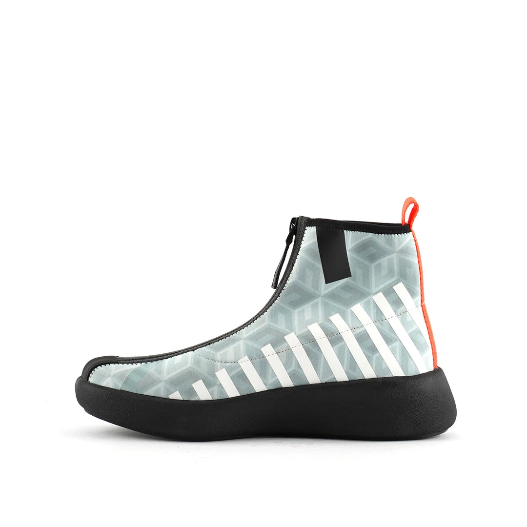 The Bo Calli is a unisex high-top sneaker with a smooth neoprene sock-like upper and ultralight rubber outsole. The sneaker is accented with bold heat pressed graphic lines and finished with a zipper at the instep for easy on and off wear.