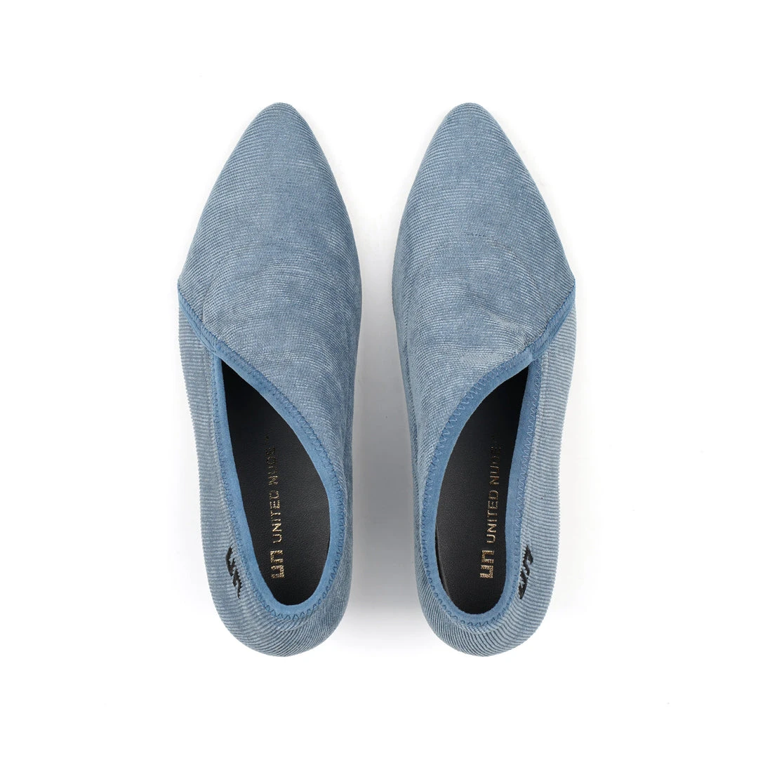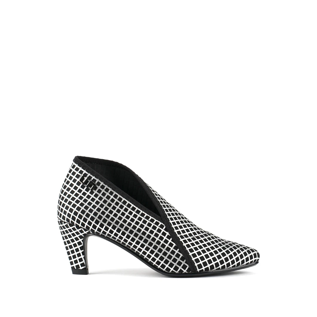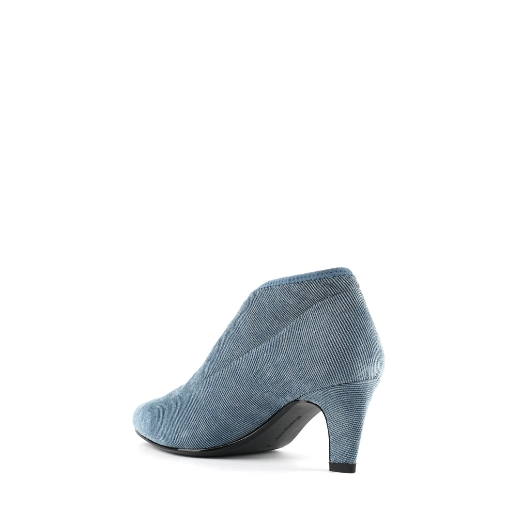 The Fold Lite Mid is a mid-heel ankle bootie with a soft almond toe and asymmetrical top line.