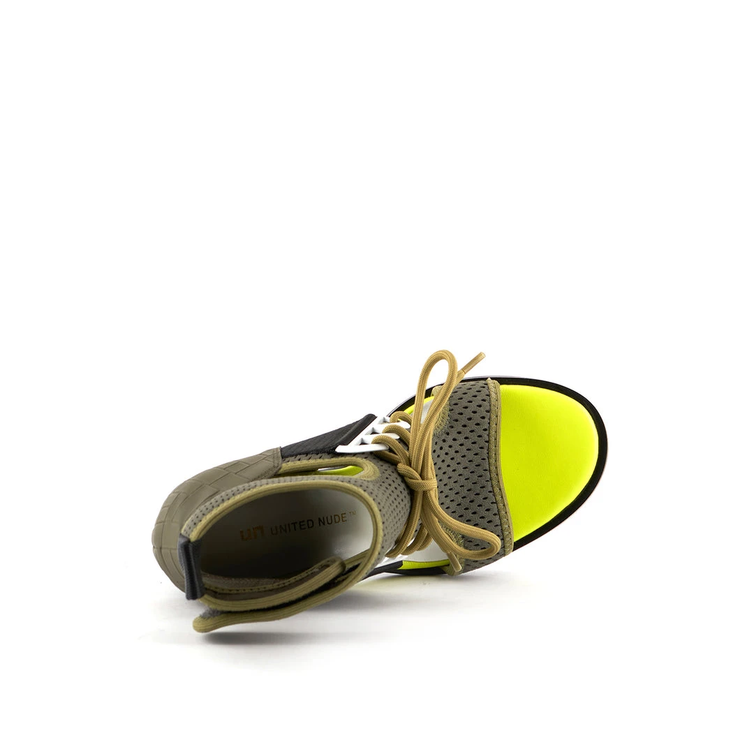The Lev Nomad Hi is UN’s take on the summer bootie with a sporty feel. This style features a hybrid bootie lifted by a slim, angular heel, mesh neoprene upper with cut-outs, and technical trimmings.