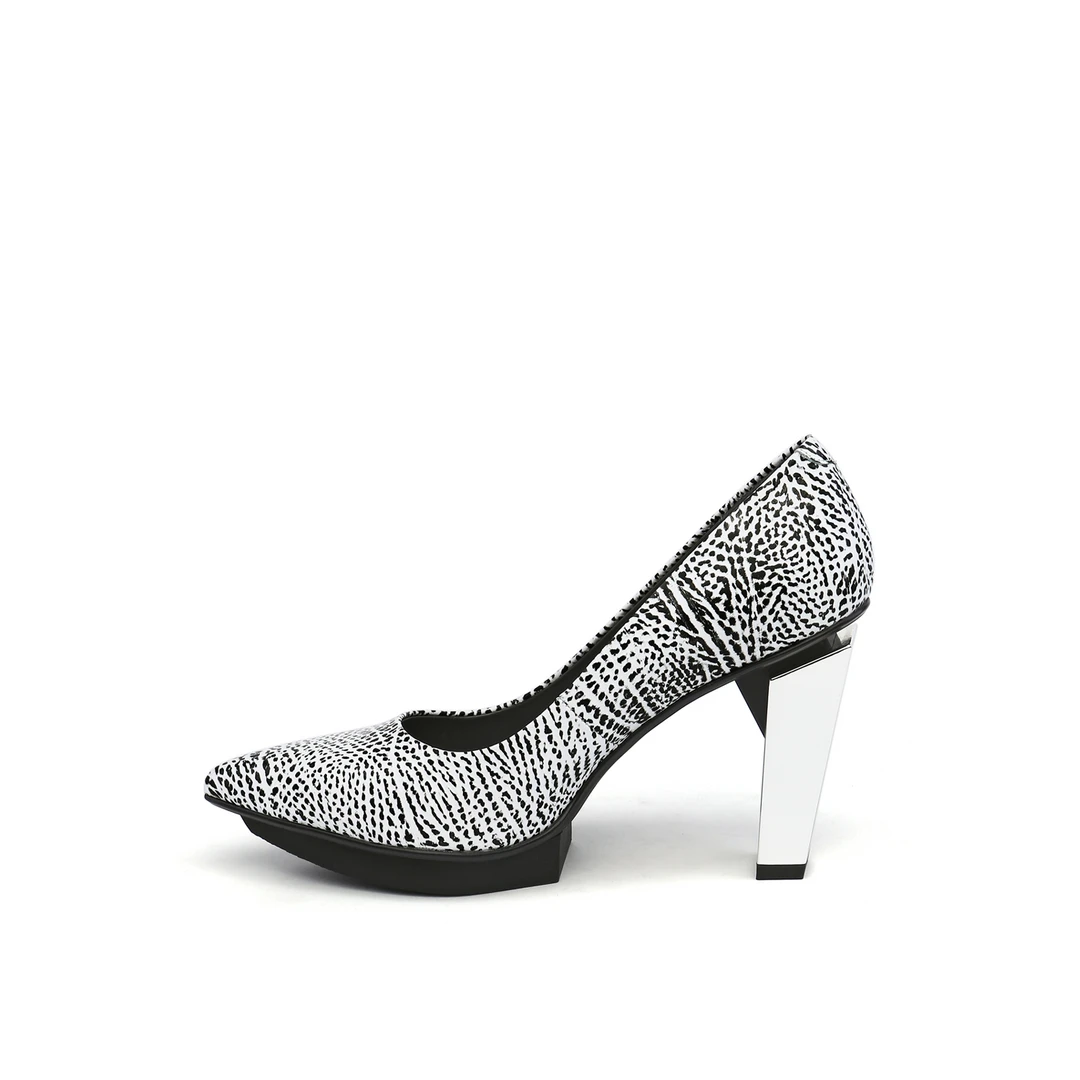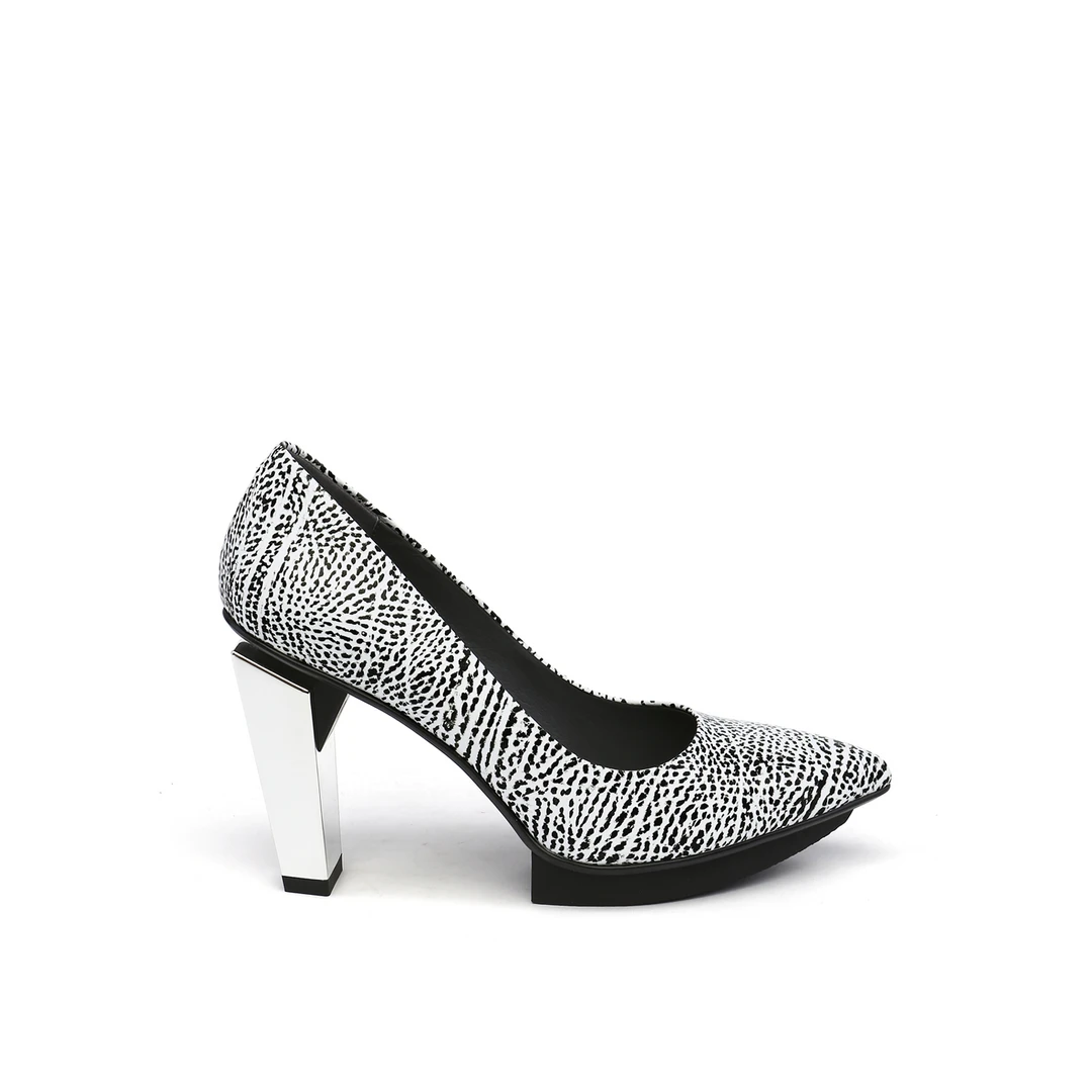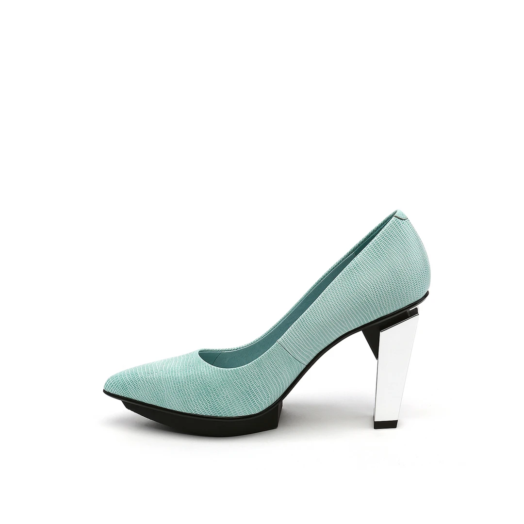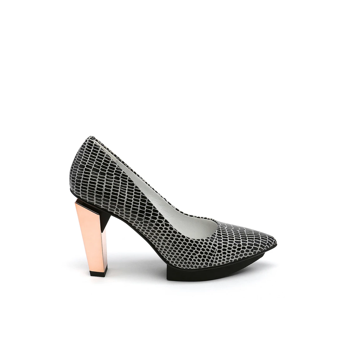 The LEV Pump Hi is a classic platform high heel pump featuring a sleek pointed toe and a striking chrome-plated heel.