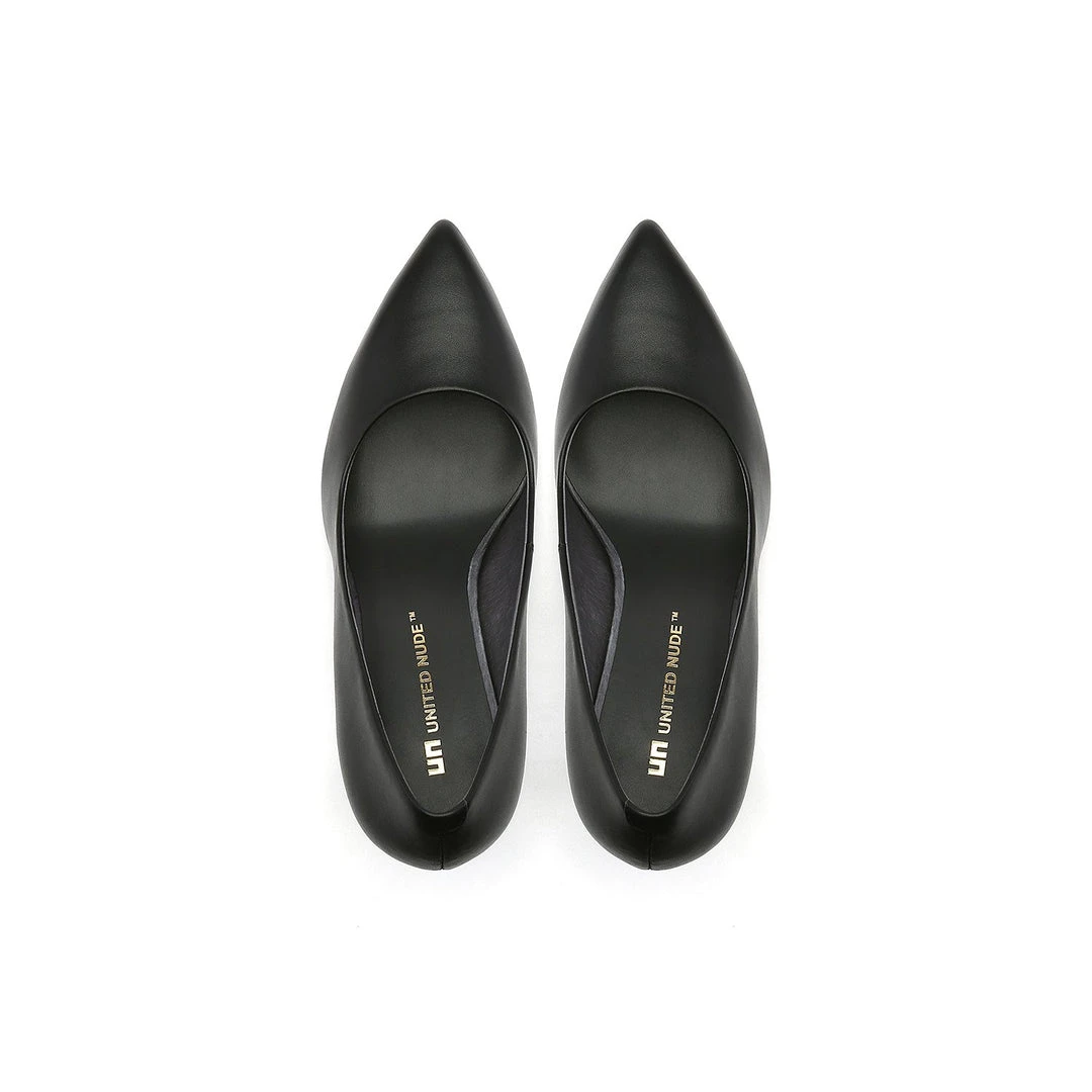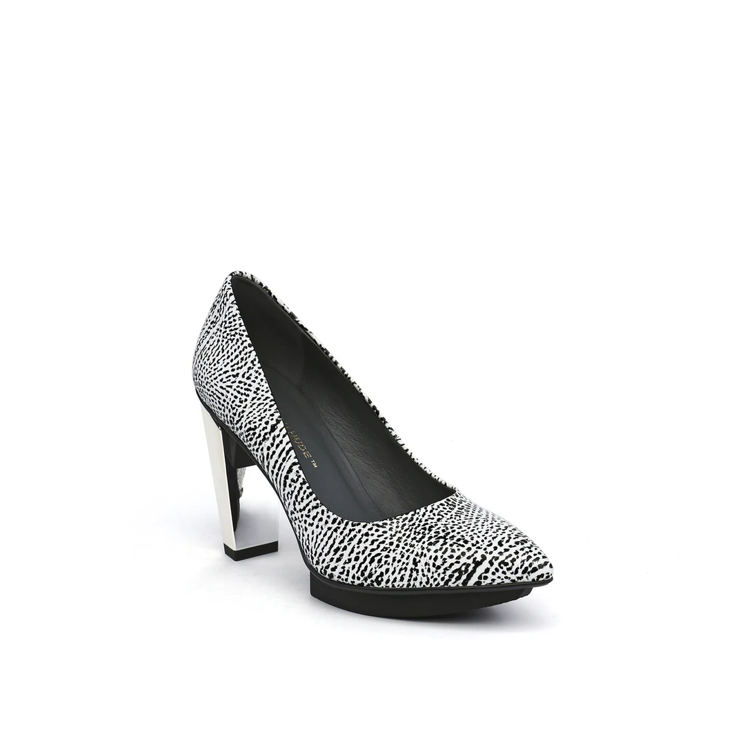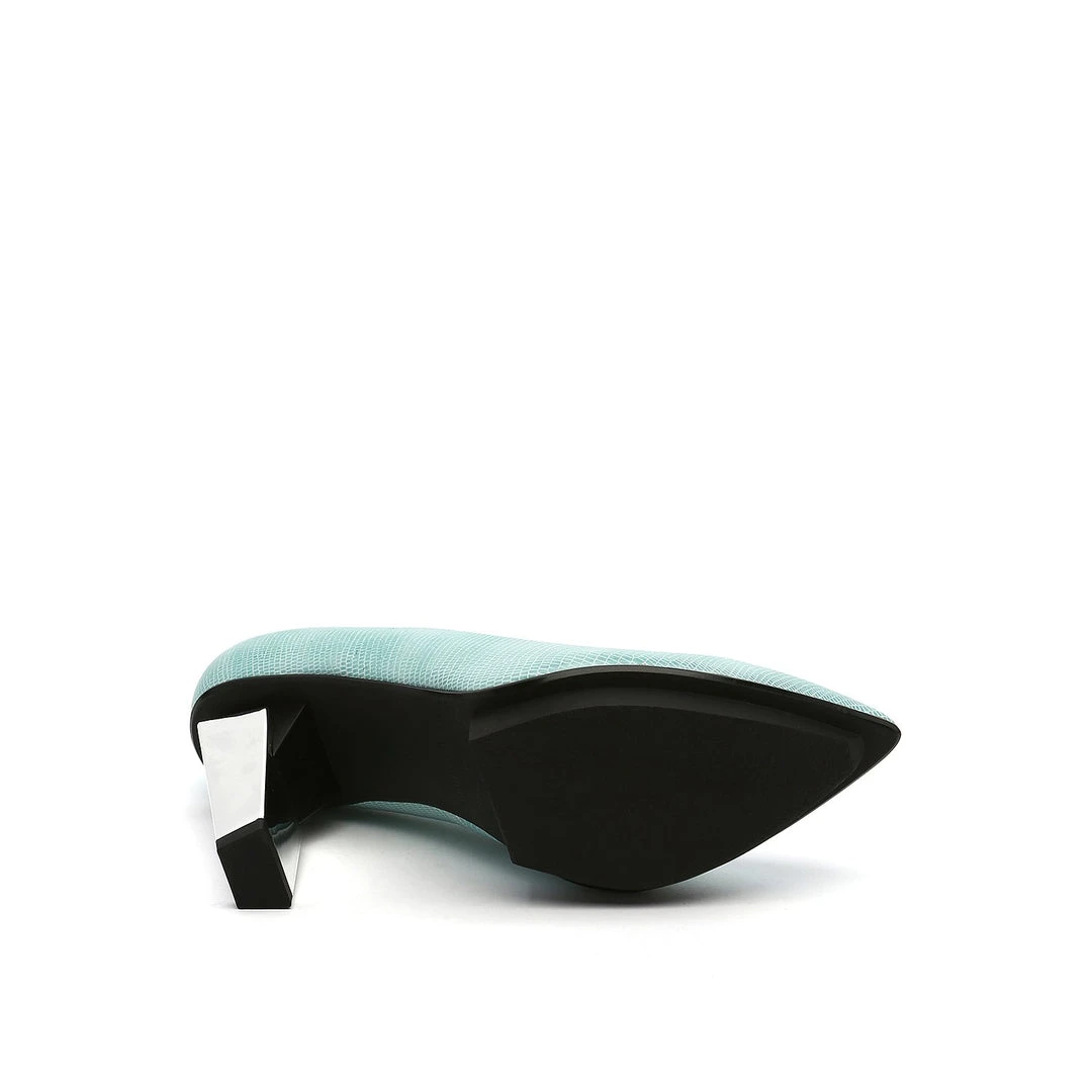 The LEV Pump Hi is a classic platform high heel pump featuring a sleek pointed toe and a striking chrome-plated heel.