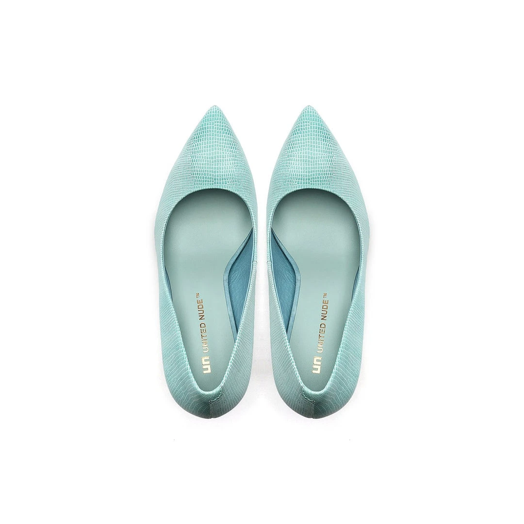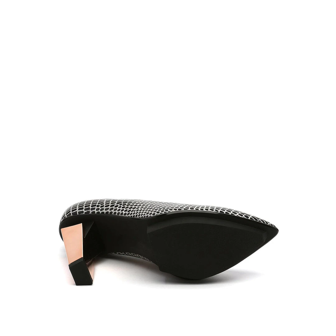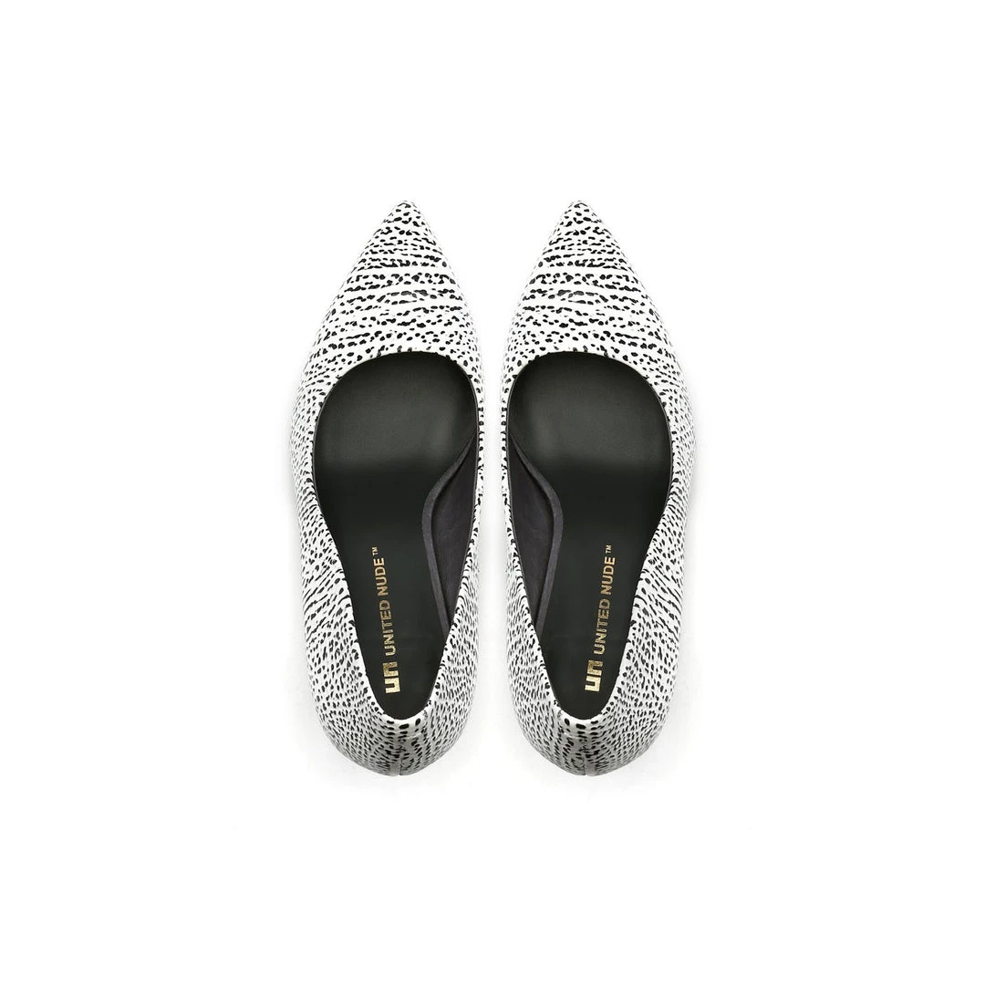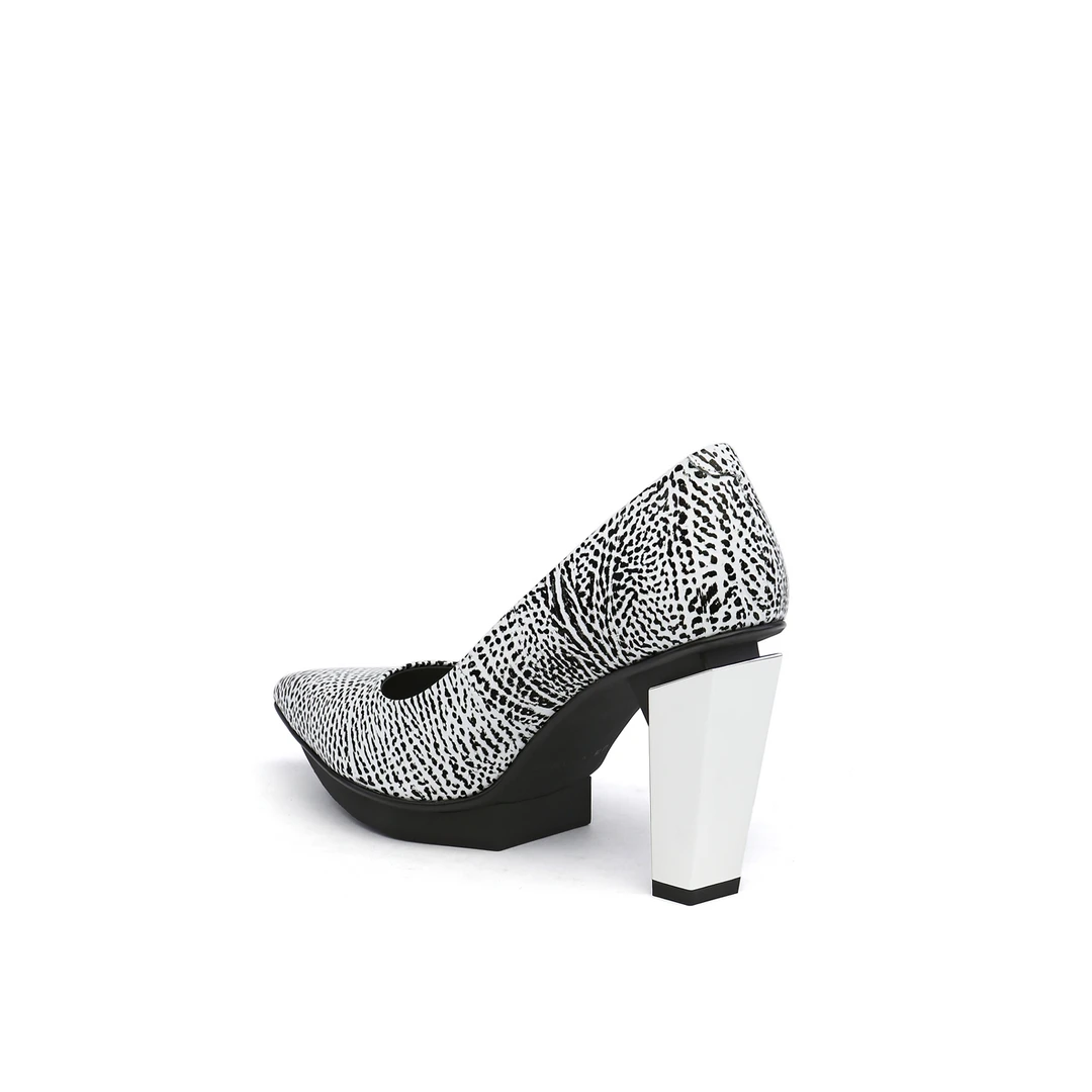 The LEV Pump Hi is a classic platform high heel pump featuring a sleek pointed toe and a striking chrome-plated heel.