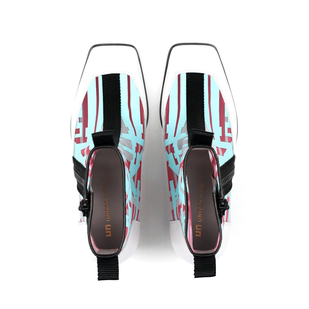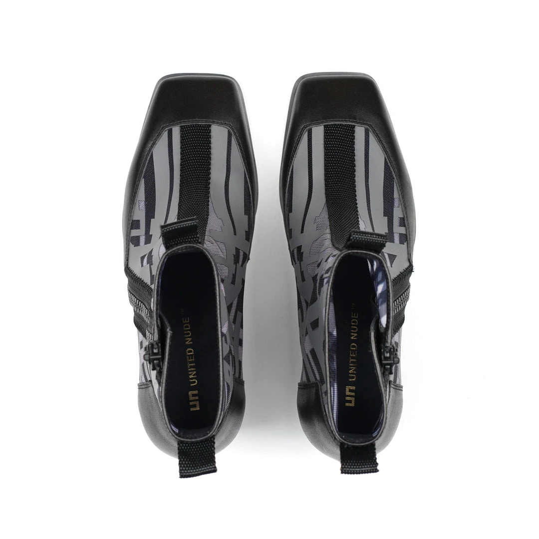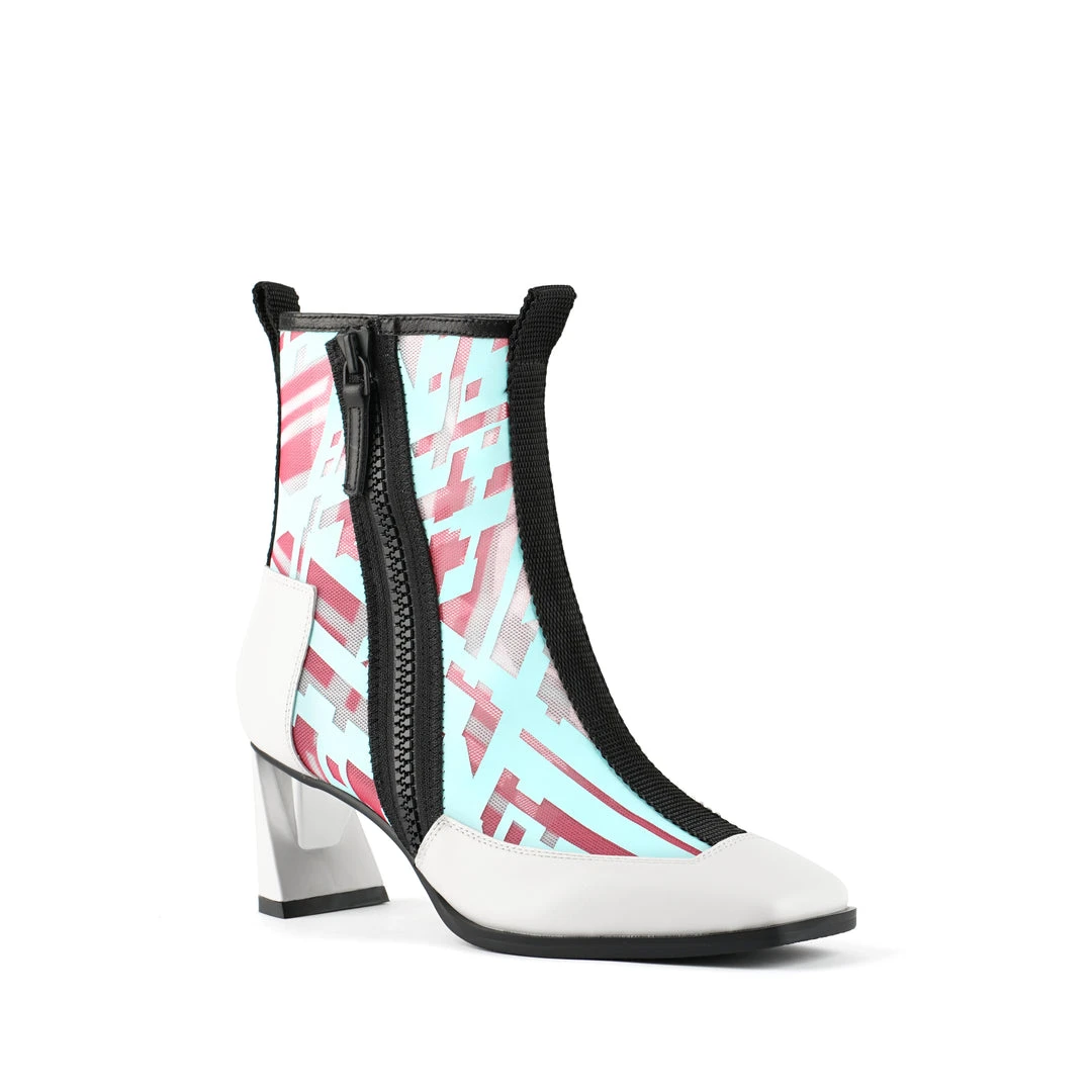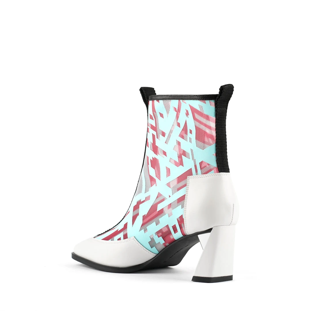 The Rasa Bootie Mid is a mid heel boot with a square toe and a breathable transparent mesh upper framed by leather accents. One side zipper enclosure and two pull tabs offer easy on and off wear. The heat pressed graphics and striking color breaks are inspired by a series of mixed media paintings by United Nude founder and creative director Rem D. Koolhaas.