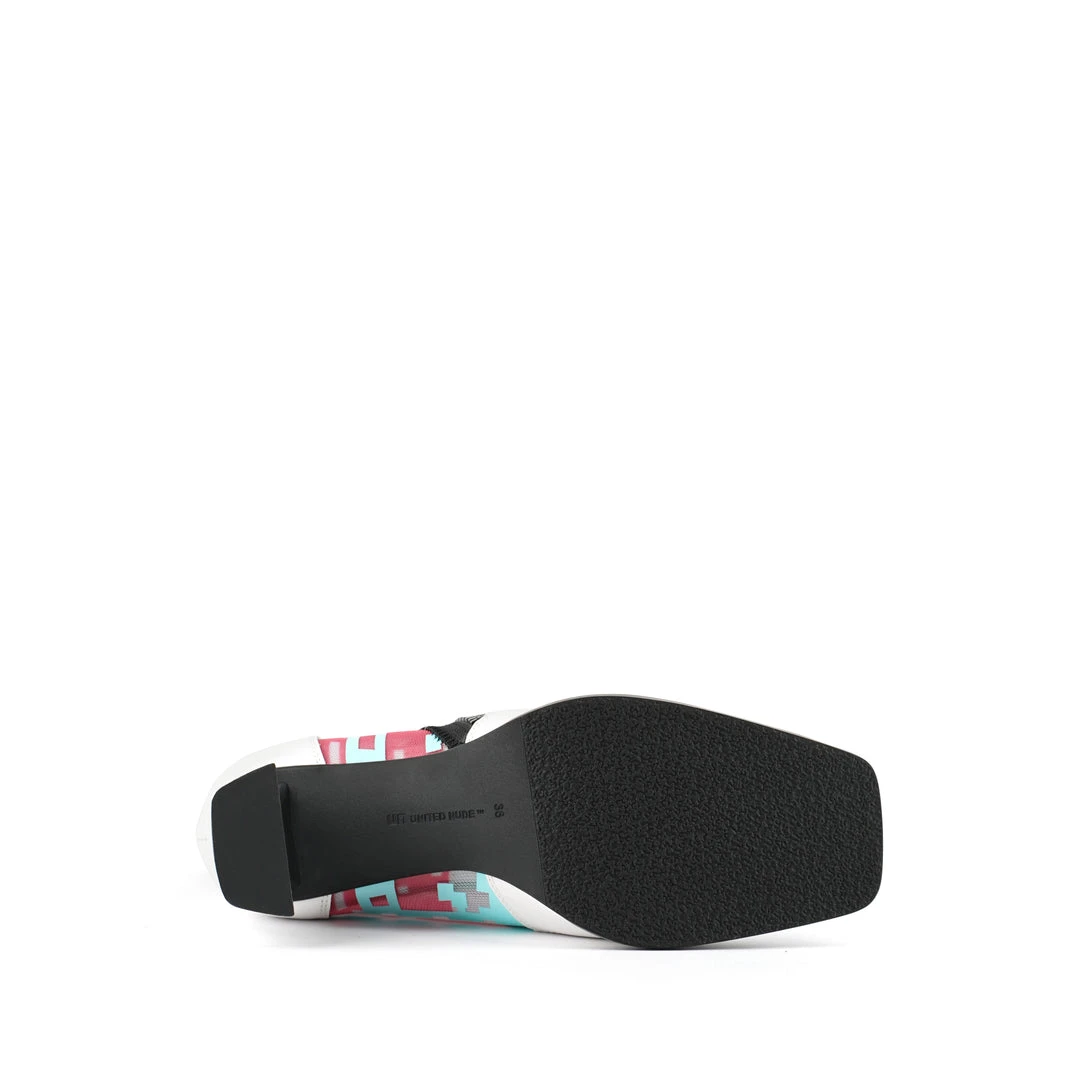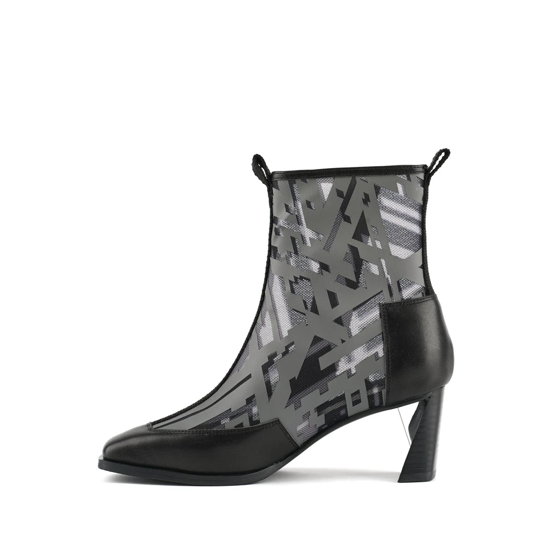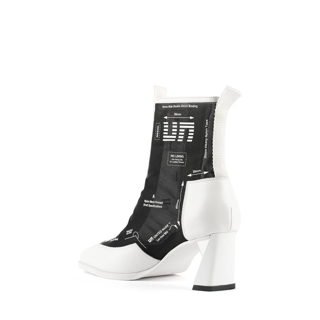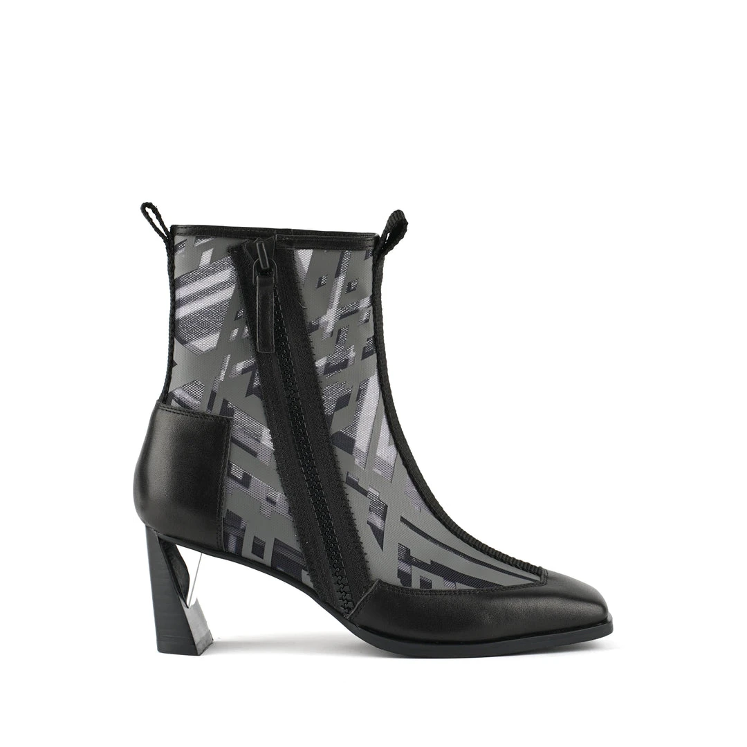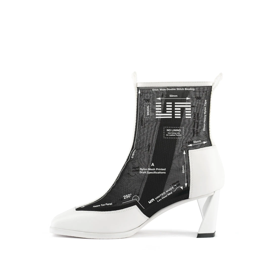 The Rasa Bootie Mid is a mid heel boot with a square toe and a breathable transparent mesh upper framed by leather accents. One side zipper enclosure and two pull tabs offer easy on and off wear. The heat pressed graphics and striking color breaks are inspired by a series of mixed media paintings by United Nude founder and creative director Rem D. Koolhaas.