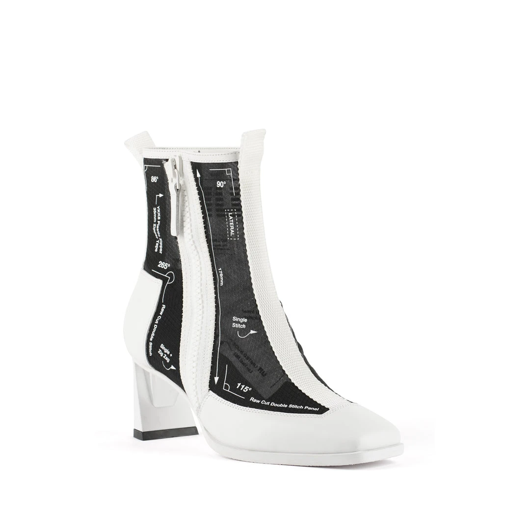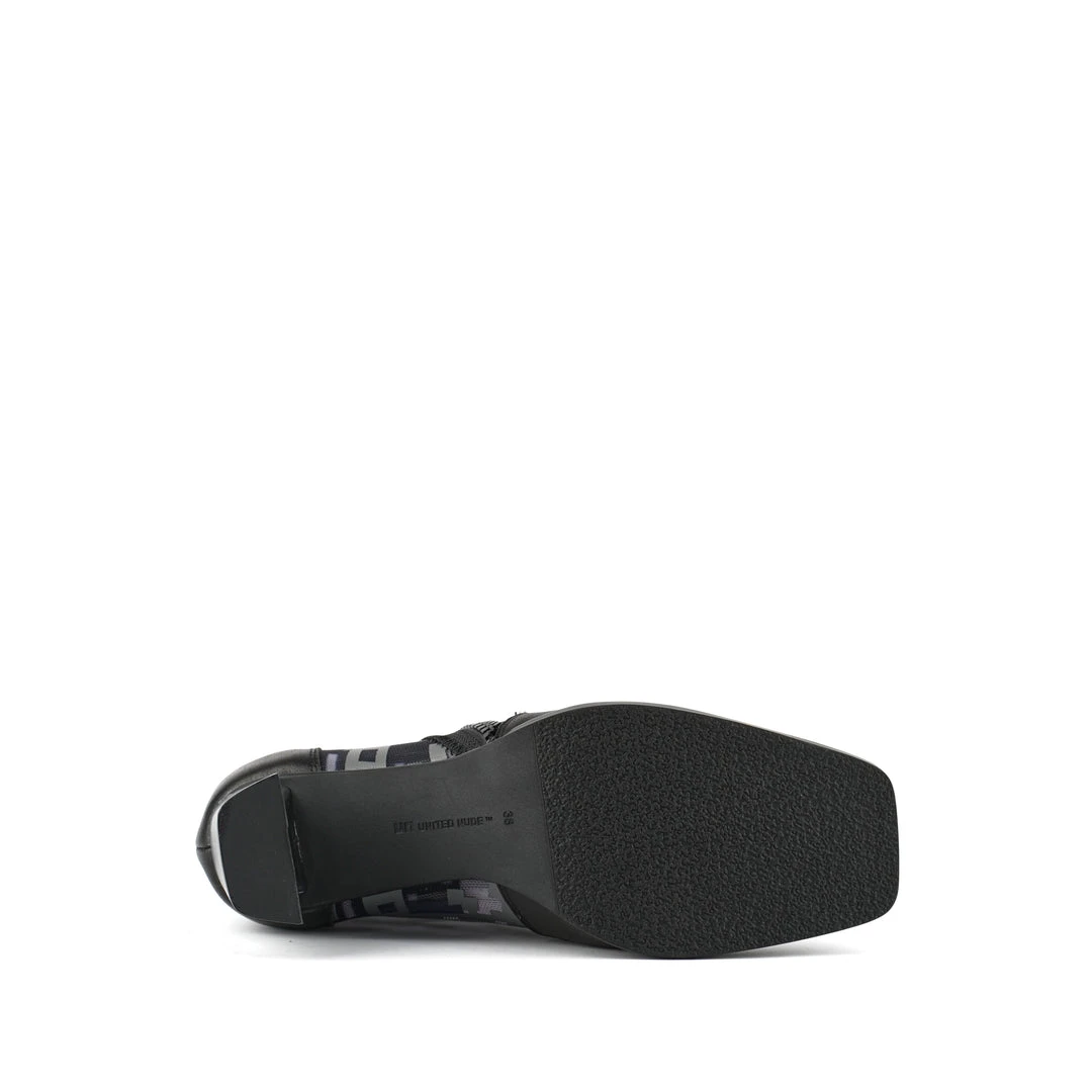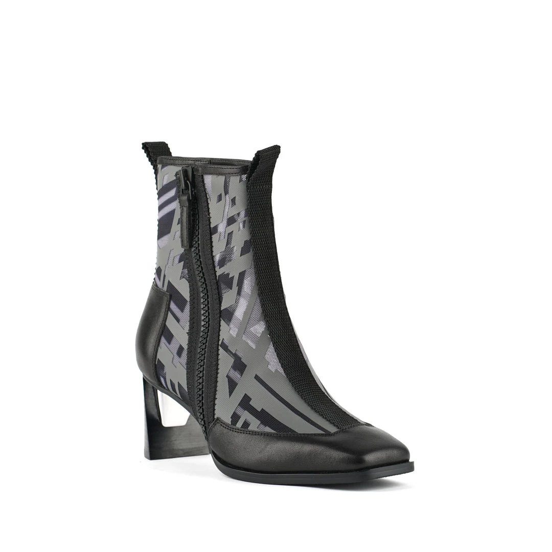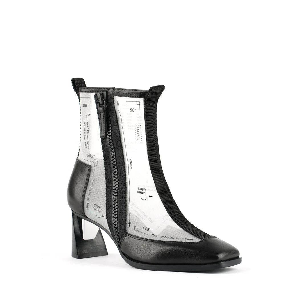 The Rasa Bootie Mid is a mid heel boot with a square toe and a breathable transparent mesh upper framed by leather accents. One side zipper enclosure and two pull tabs offer easy on and off wear. The heat pressed graphics and striking color breaks are inspired by a series of mixed media paintings by United Nude founder and creative director Rem D. Koolhaas.