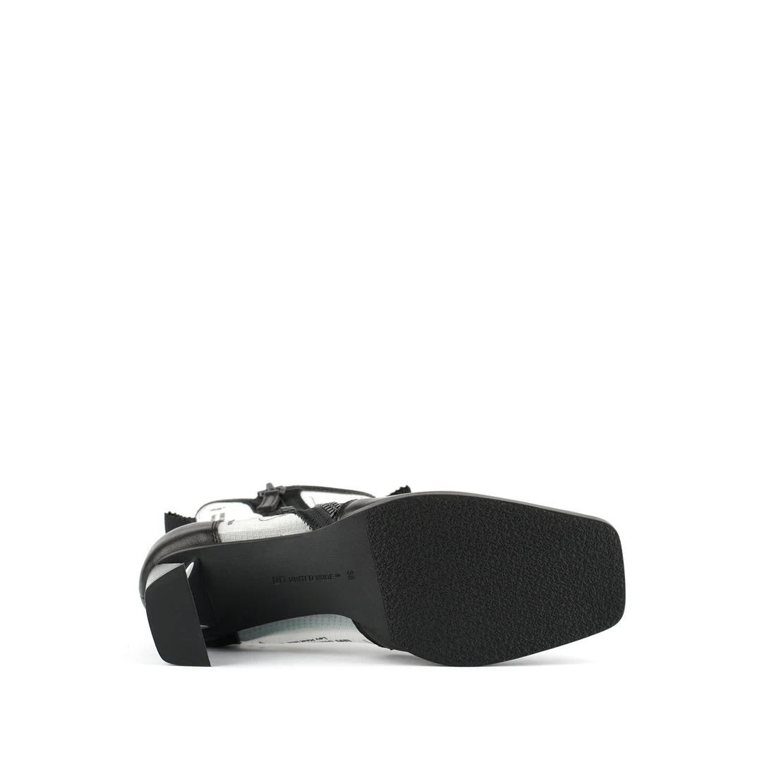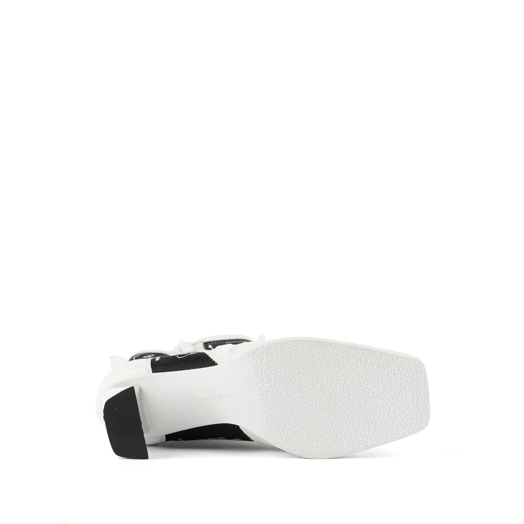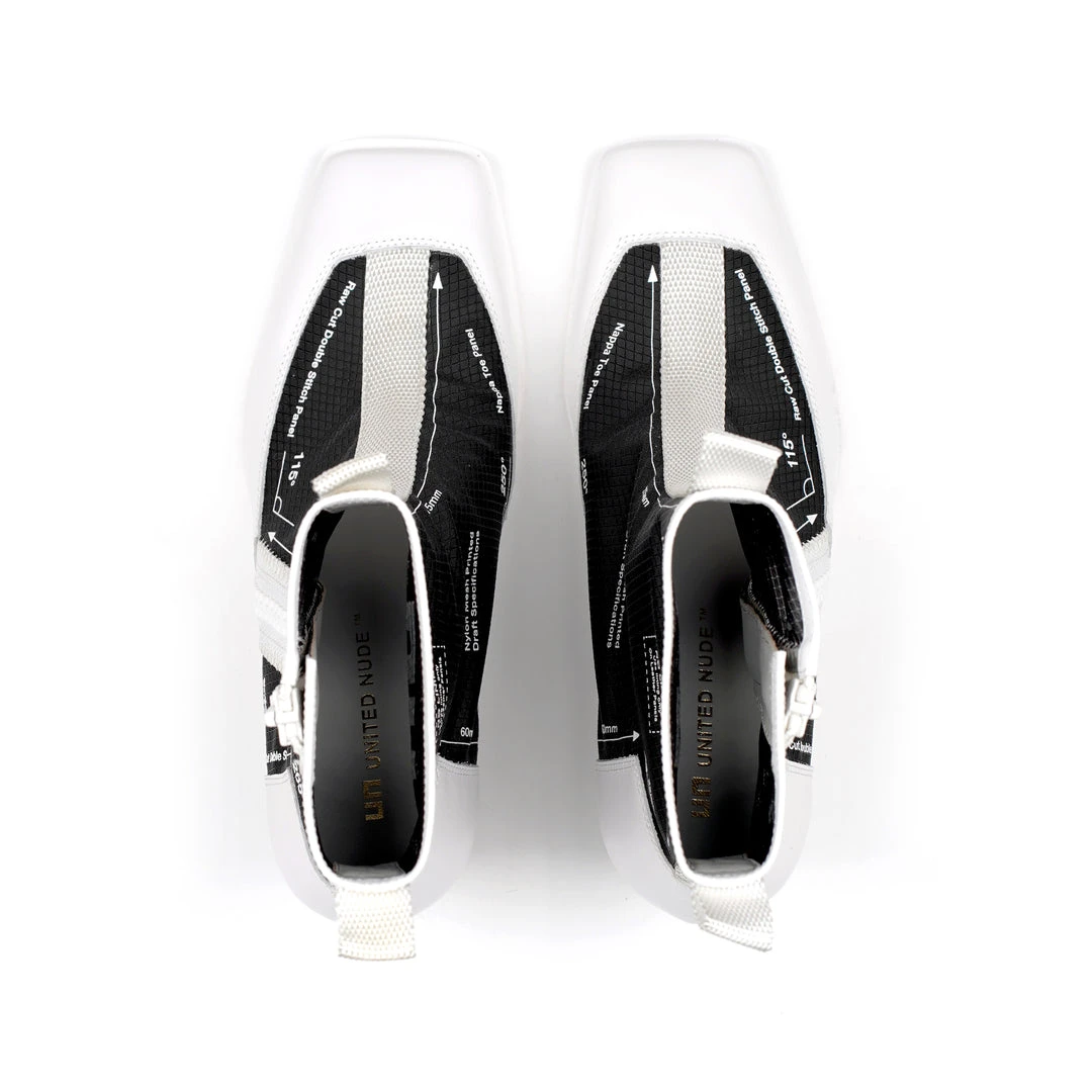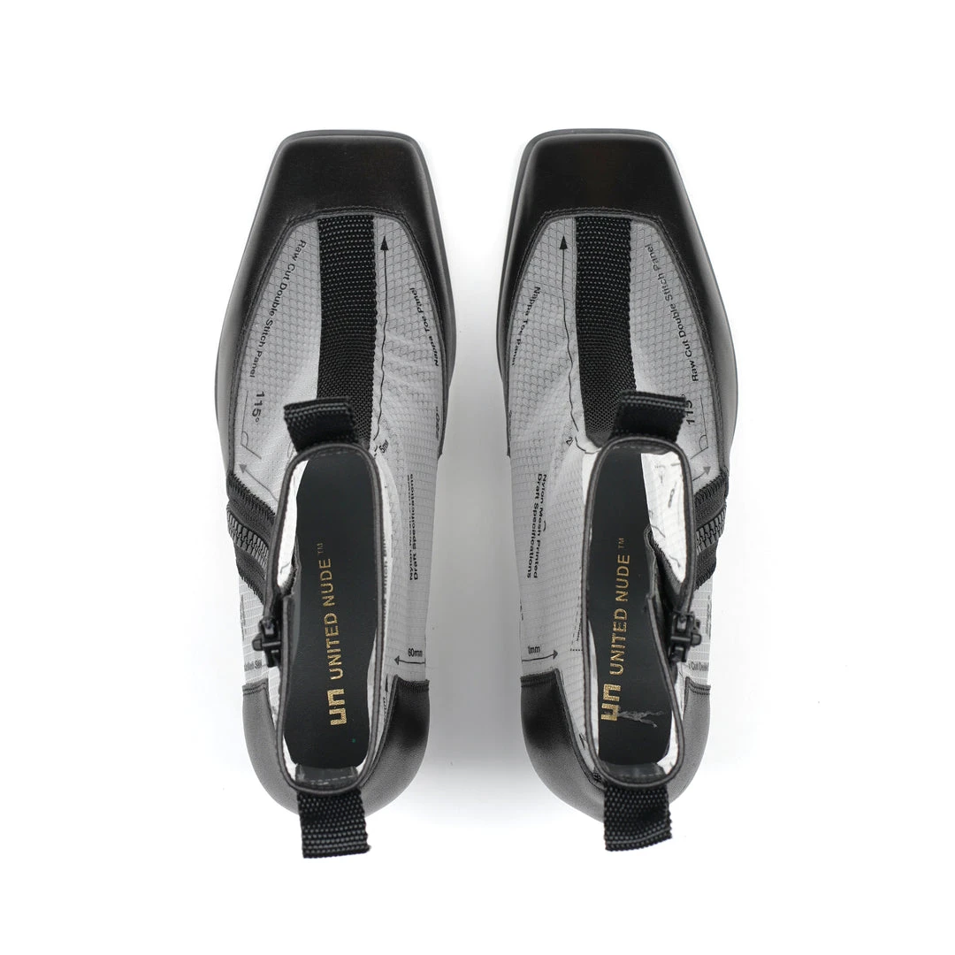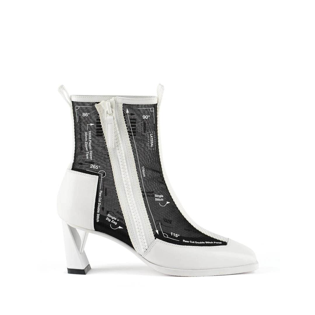 The Rasa Bootie Mid is a mid heel boot with a square toe and a breathable transparent mesh upper framed by leather accents. One side zipper enclosure and two pull tabs offer easy on and off wear. The heat pressed graphics and striking color breaks are inspired by a series of mixed media paintings by United Nude founder and creative director Rem D. Koolhaas.
