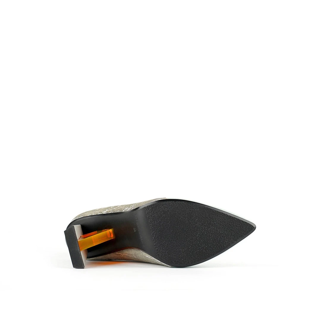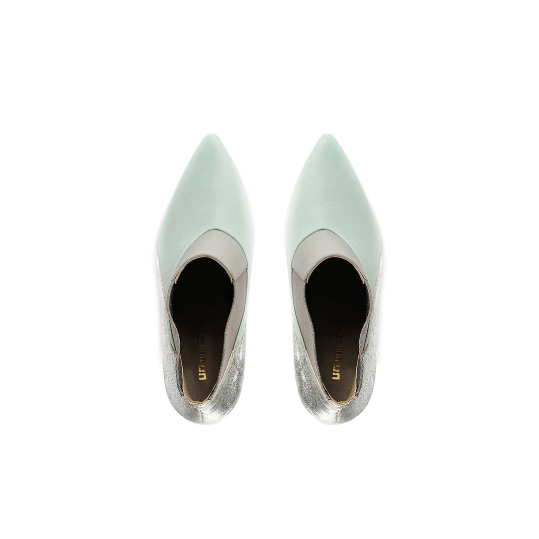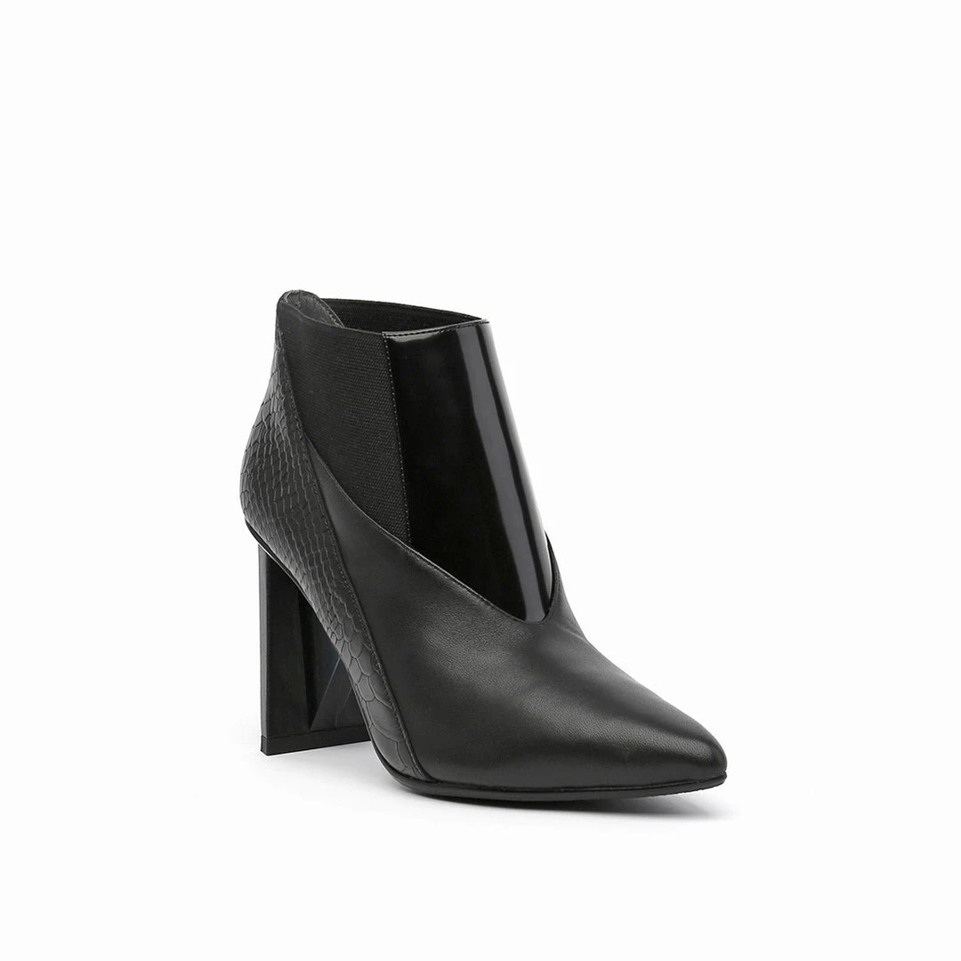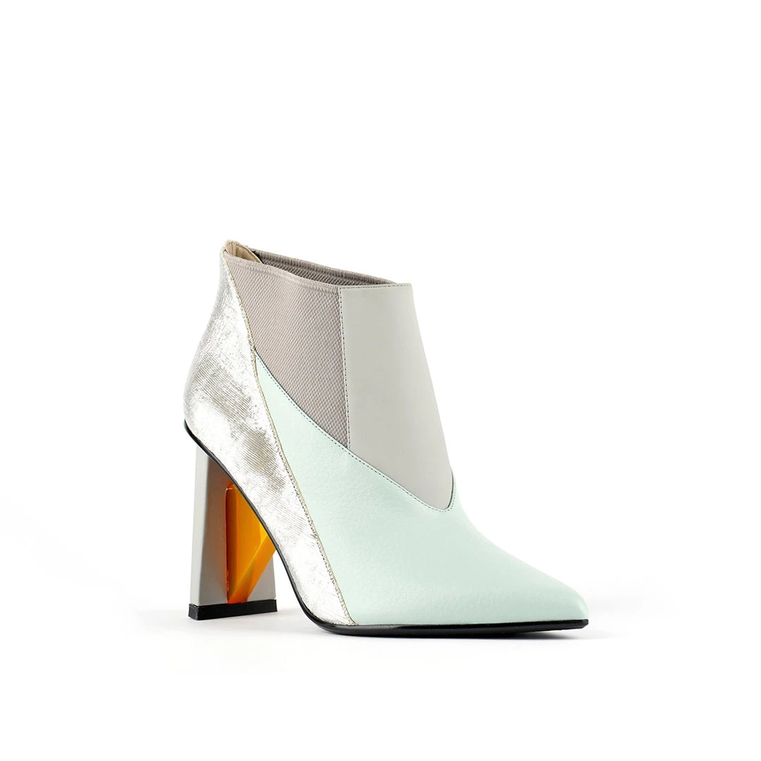 The Spark Bootie Hi is a pointed toe high heel boot with a multi-material abstract heel. A patchwork of leathers and elastics create a bold statement to complement the statement heel.