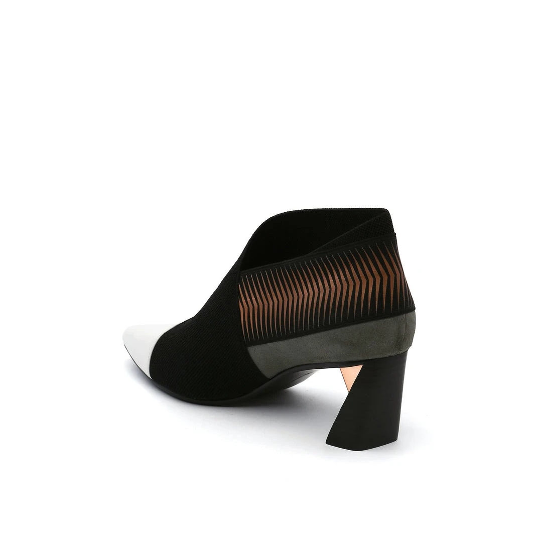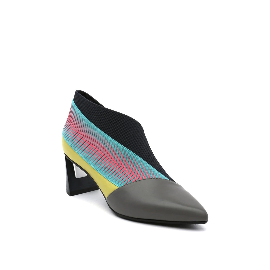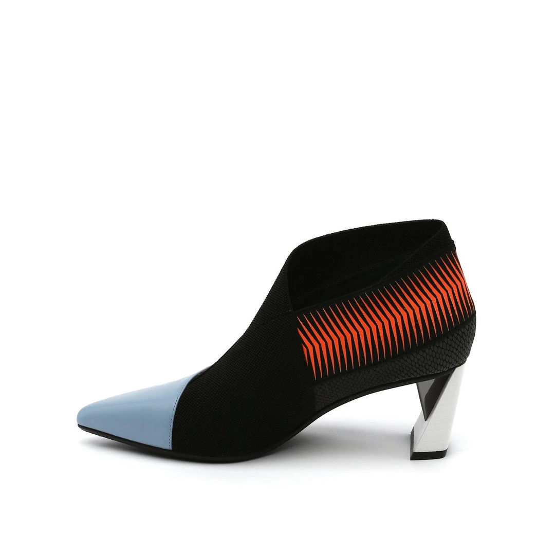 The Zink Pop Mid is a mid height pointy-toe ankle bootie that is energized with a graphic elastic band that encapsulates the foot.